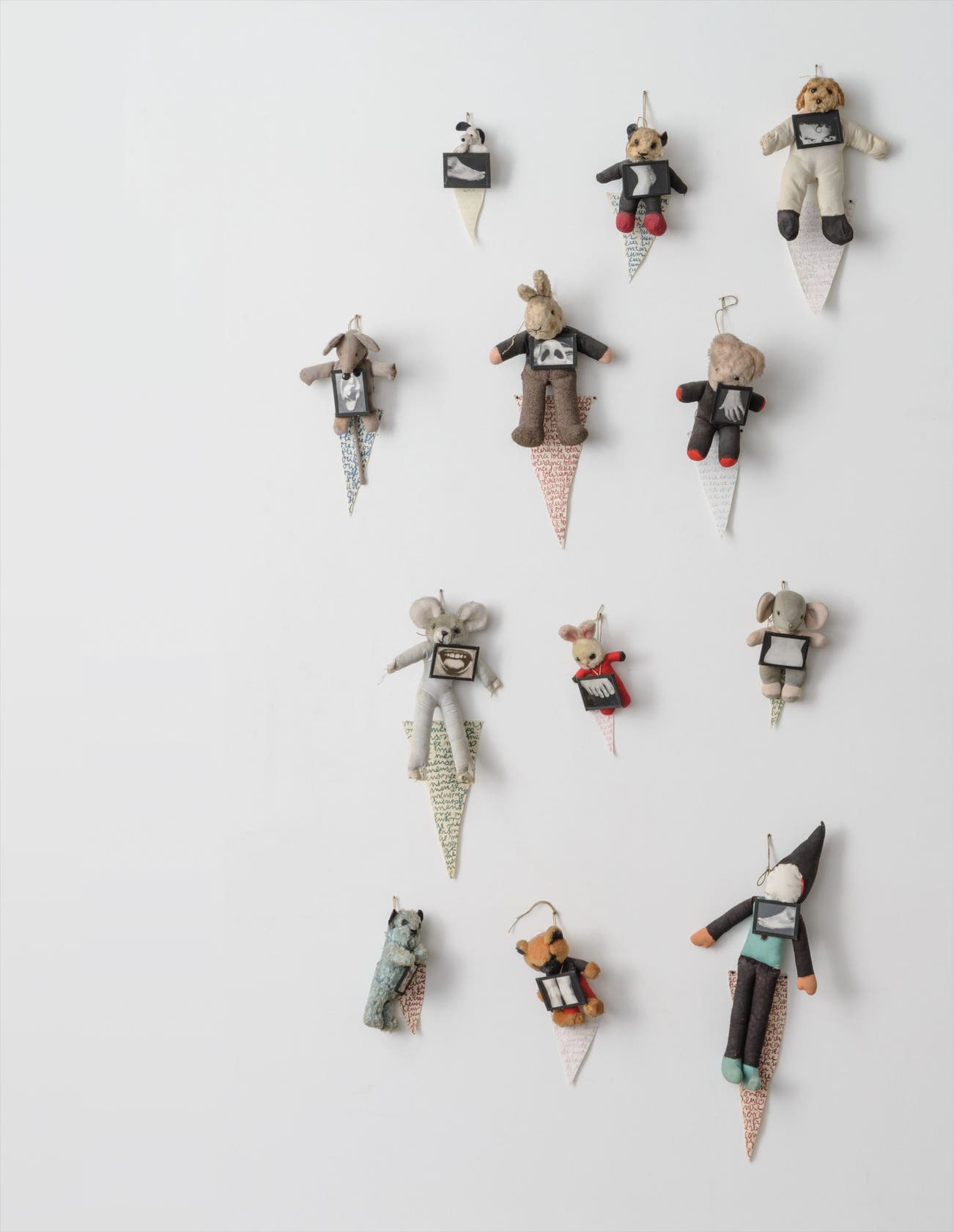 plush toys, gelatin silver prints under glass, colored pencil on wall