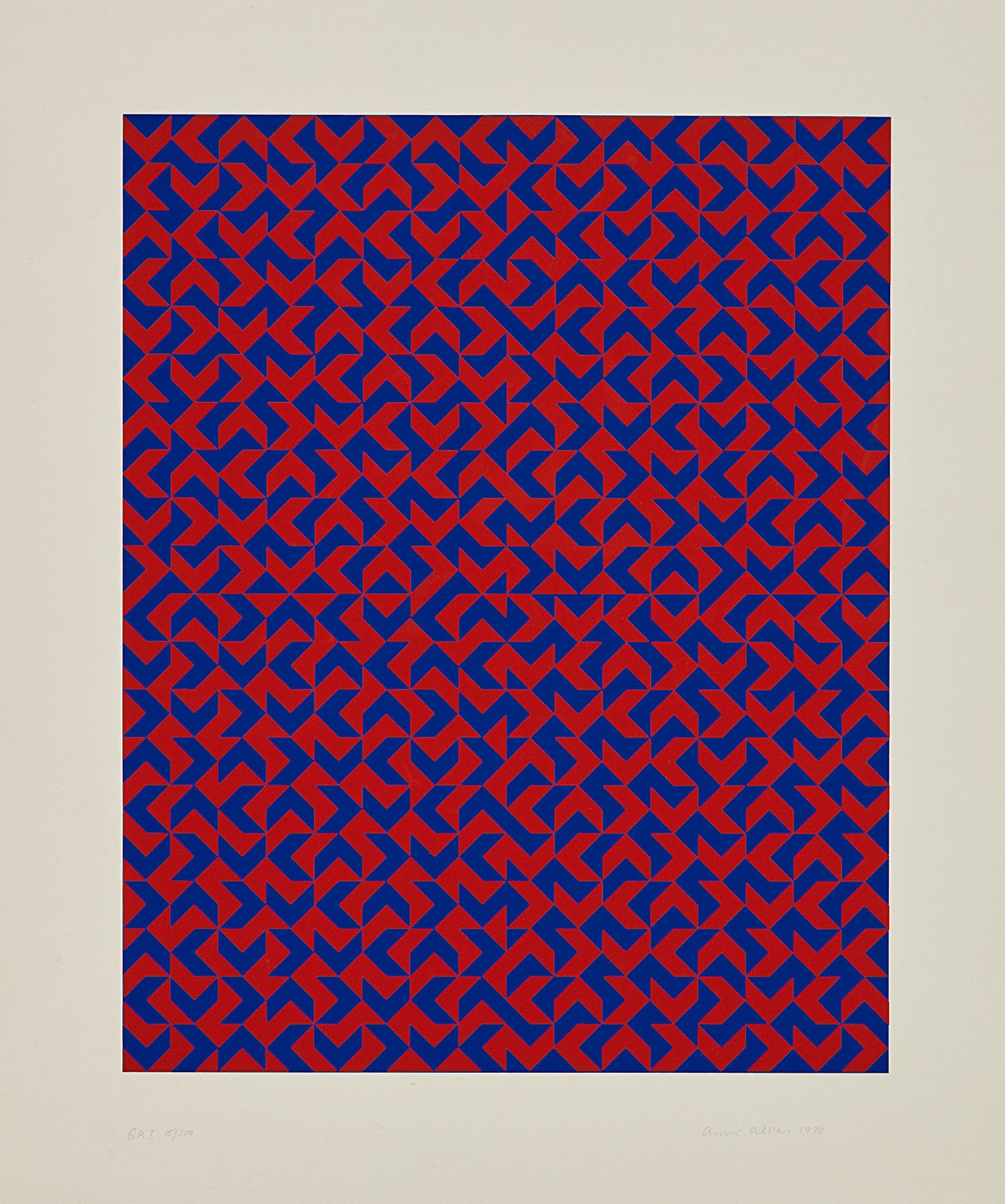 Later in life, Albers became a prolific printmaker. As in her textile work, her prints are characterized by bold geometric patterns and an inventive use of color. Living in the United States afforded her the opportunity to travel extensively in Mexico and South America, where she became interested in and inspired by Pre-Columbian art. Albers passed away in 1994 in her adopted home of New Haven, CT.