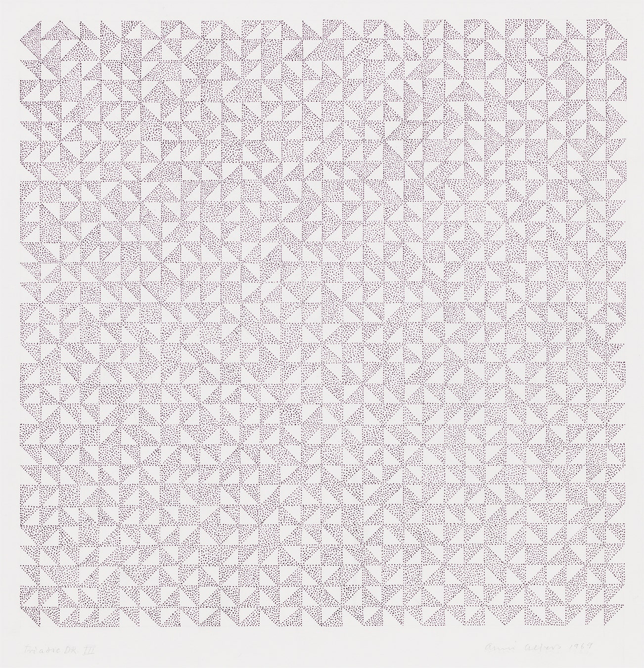 Later in life, Albers became a prolific printmaker. As in her textile work, her prints are characterized by bold geometric patterns and an inventive use of color. Living in the United States afforded her the opportunity to travel extensively in Mexico and South America, where she became interested in and inspired by Pre-Columbian art. Albers passed away in 1994 in her adopted home of New Haven, CT.
