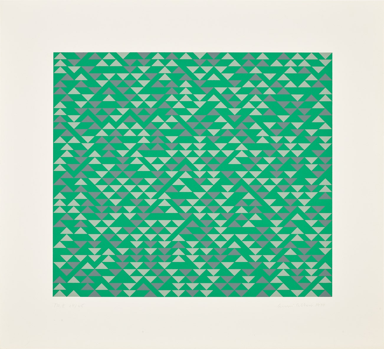 Later in life, Albers became a prolific printmaker. As in her textile work, her prints are characterized by bold geometric patterns and an inventive use of color. Living in the United States afforded her the opportunity to travel extensively in Mexico and South America, where she became interested in and inspired by Pre-Columbian art. Albers passed away in 1994 in her adopted home of New Haven, CT.