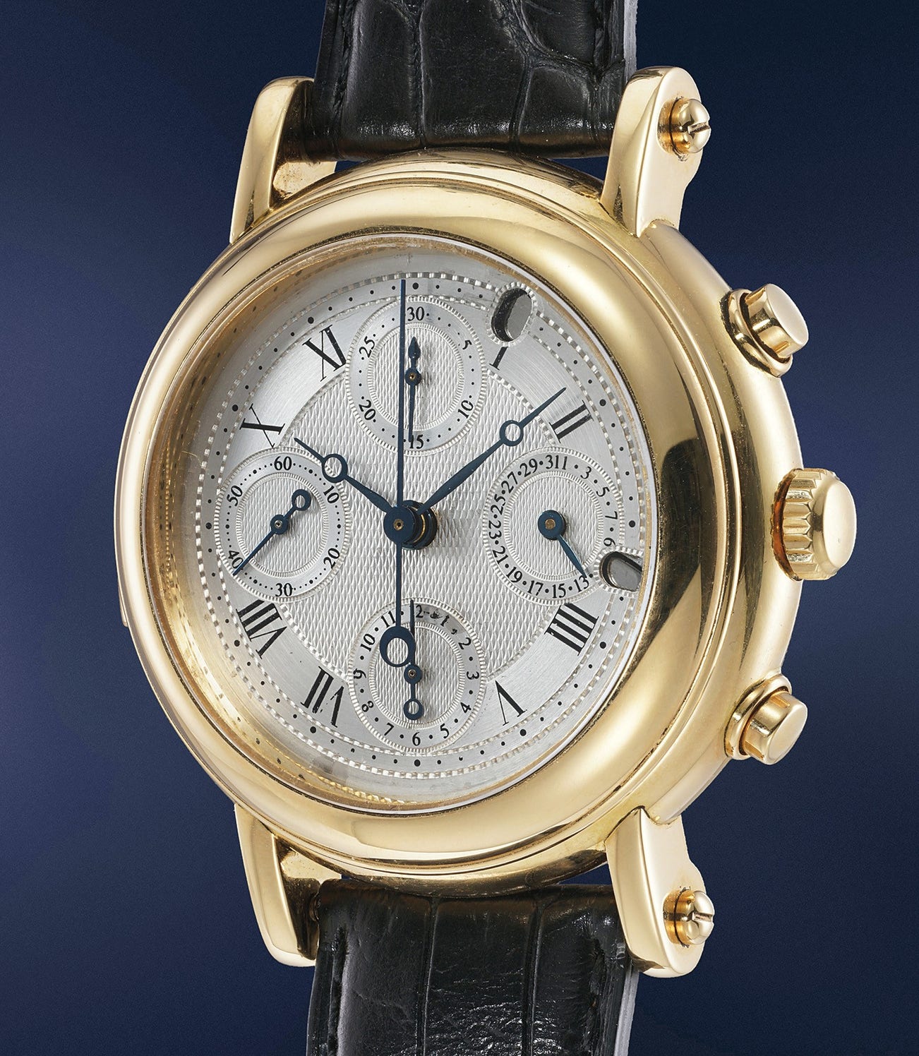 The present watch thus represents a “rendez-vous of titans”, being a special commission featuring a chronograph movement with date, and minute repeater mechanism executed by F.P. Journe, and a sublimely executed gold Hagmann case.