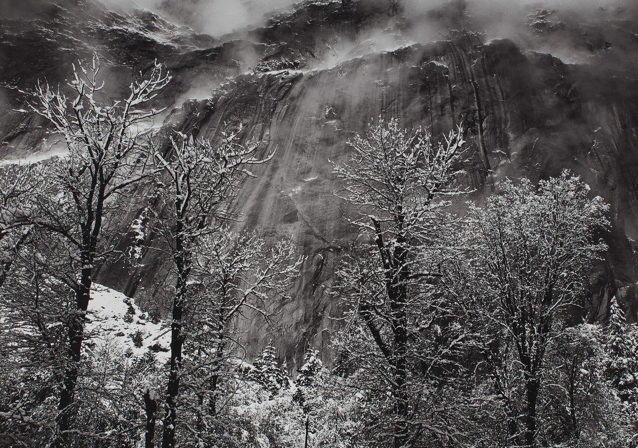 "In time of storm the clouds seek each other among the crags, and snow falls quietly, whitely, lavishly, filtering into the deepest recesses of the forest, powdering tree and stone and piling high in the gorges and grottoes of the cliffs. As the clouds break a dazzling shining world appears, unearthly and quiet except for the mutter and boom of distant avalanches and the near thudding of fresh snow dropping from the pines." – Ansel Adams
