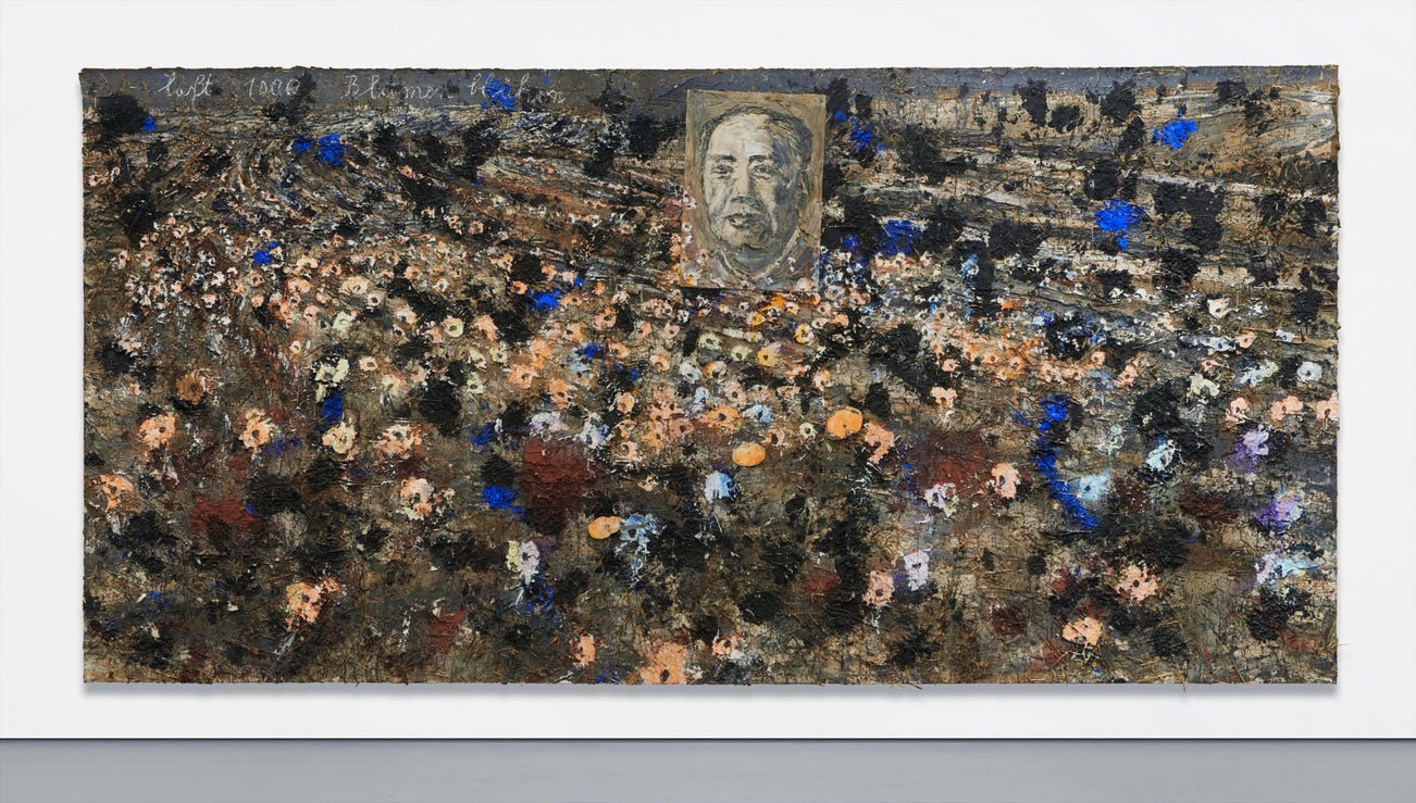 Complicating straightforward readings, Kiefer embraces the symbology of the flower to explore the ambiguous legacy of the poet-turned-politician Mao. The flower is a key motif in Kiefer’s oeuvre that alludes to a wide range of ancient and Pagan myths, as well the Rosicrucian conception of the mystical rose as exemplary of cosmic totality. It symbolizes perishability and death, but also origin and fertility. In Laßt 1000 Blumen blühen, the flowers gradually encroach upon the sacred space of the Mao portrait – heightening the sense of eerie disconnect between the static image of Mao and the dynamic force of nature. With Laßt 1000 Blumen blühen Kiefer presents to us a powerful painting that, while wrestling with the traumas of history, suffering and loss, also harbors the possibility of transformation and new beginnings.