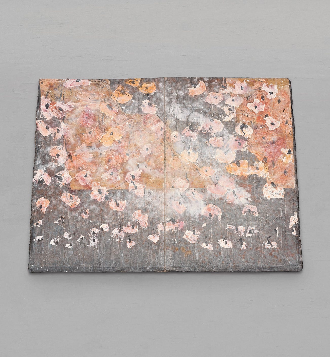 A unique sculpture that eschews immediate clarity, Blutblume, 2001, captures Anselm Kiefer’s proximity to literature, alchemy and cosmogony, whilst materialising the artist’s desire to express the inherent paradoxes of life. Echoing the name of a flowering plant – also known as a blood lily or paintbrush lily – Blutblume forms part of a cycle of works that Kiefer built over forty-five years, comprising hundreds of unique books made of lead, plaster and cardboard, oftentimes ornate with paint, sand and flowers, and bound like ancient grimoires. Herein, Blutblume’s thirty-four pages are adorned with paint and collaged paper, together conjuring the delicate and lively appearance of a bed of blood lilies. However, the book itself is physically mute, as the act of flicking is made impossible by the sheer weight of the object. ‘The lead books are thus complete paradoxes’, Kiefer observed. They are like ‘an allusion to the dialectic of being and nothingness’ (Anselm Kiefer, quoted in Olivier Cena, ‘A la BNF, Anselm Kiefer expose ses livres sacrés’, Télérama, 30 October 2015, online). Connecting culture and nature, order and chaos, Blutblume functions as ‘a link that holds together opposites’, encapsulating the artist’s intimate expression ‘through which the human is connected to the natural, the terrestrial to the celestial’ (Germano Celant, quoted in ‘The Destiny of Art: Anselm Kiefer’, Anselm Kiefer, Milan, 1997, p. 15).