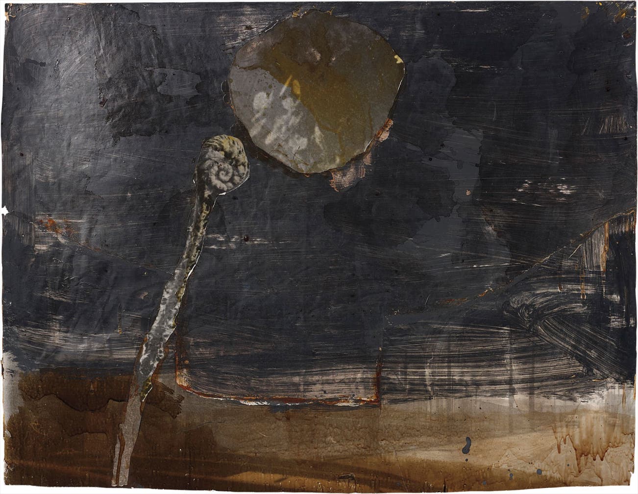 oil paint, varnish, photographic print and paper collage laid on board