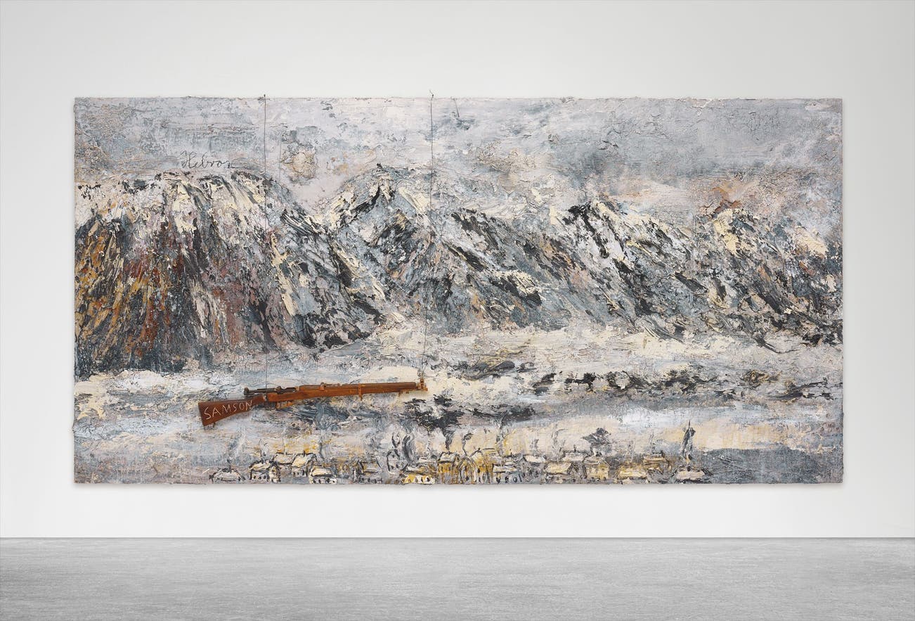 During the time this series was created, Kiefer was honoured in Germany and the United States, awarded with the Berliner Bär B.Z.-Kulturpreis as well as the Leo Baeck Medal in recognition of his contributions to German and Jewish reconciliation. Certainly, Alkahest is a culmination of the artist’s formidable use of imagery and critical exploration, an epic in scope and complexity. Pervaded by powerful notions of metamorphosis, Kiefer’s series is based on narratives inspired by the philosophical writing of Martin Heidegger, the poems of Friedrich Hölderlin, and Johann Wolfgang von Goethe, as well as Nordic mythology and biblical stories taken from the Old Testament. The present lot, Samson and Delilah, 2011, is an exemplary work from the Alkahest series, at once majestic and loaded, the viewer is presented with an awe-inspiring perspective as we gaze over a great expanse of mountain range looming over a quiet village. Affixed directly onto the canvas by two hanging wires is a large rifle incised with the name SAMSON. Floating directly above the rifle, another inscription appears hovering in the sky, Hebron, a term roughly translated to mean friend or alliance. Of course, the appearance of this word could also denote the proper name of an actual place, Mount Hebron, located in the southern West Bank and extending into Israel. This region was known for its Israelite and Hasmonean kingdoms during classical antiquity and also the geographical location of the city of Hebron.