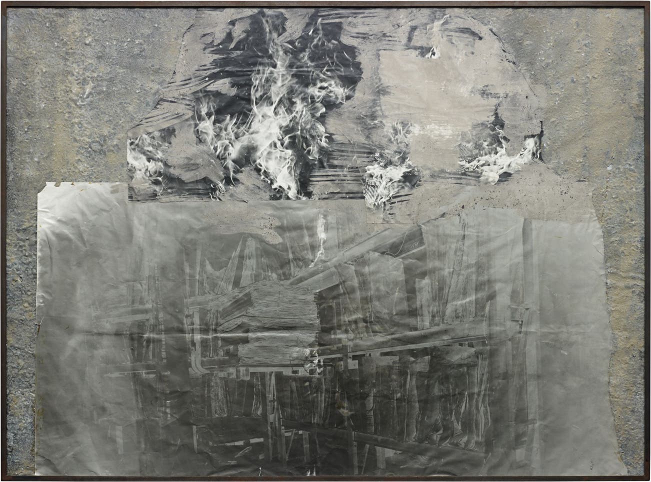 ash, pigment, original photographs on treated lead in glazed steel frame, in artist's frame