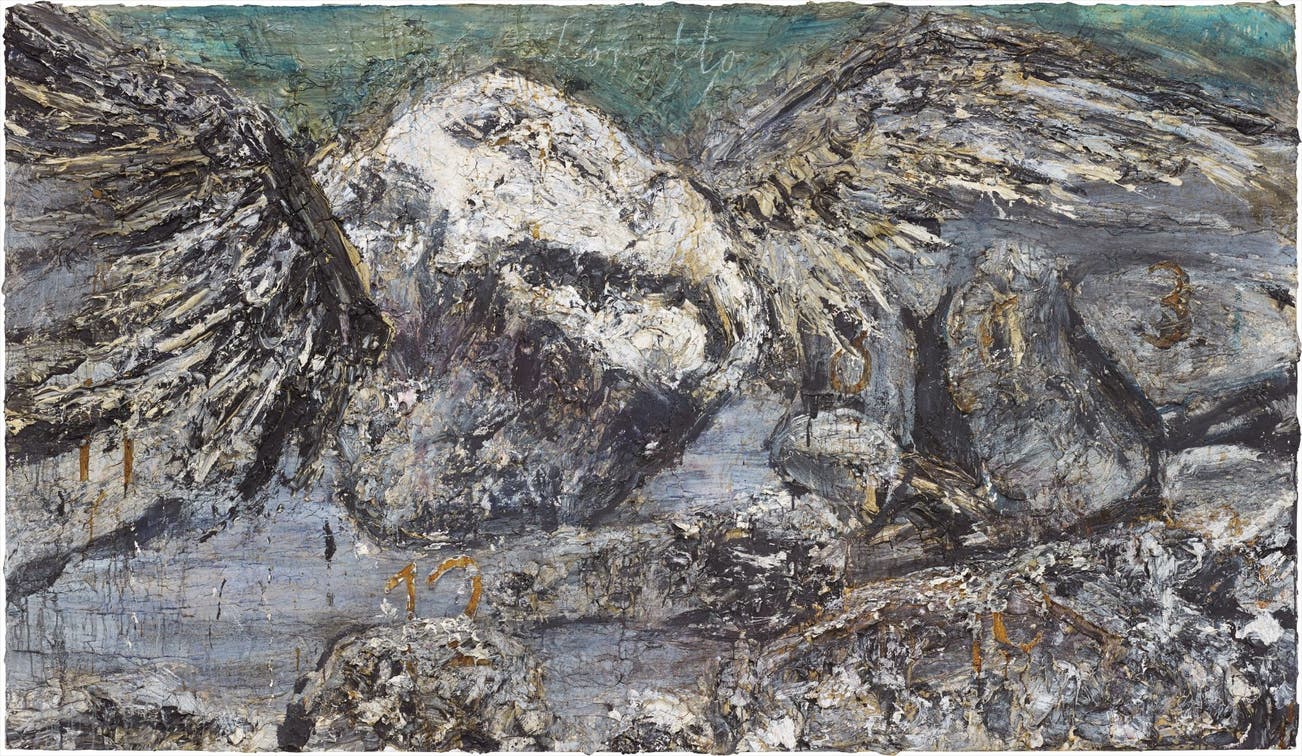 For an artist whose fundamental concern is to experience history in order to understand it, Anselm Kiefer’s own narrative becomes vital in order to both experience and comprehend the thick impastos of oil paint comprising San Loretto, 2009. Kiefer was born to an orthodox Roman Catholic family near the borders of Switzerland and France in the final weeks of the Second World War, a place where remains of the destruction were omnipresent but the war itself was never spoken of. Quietly existing just beneath the darkness, and suspended between symbols of deterioration and hope, emerges the present lot, an immense canvas portraying a winged boulder, replete in tones of jet black and ashen gray. The title alludes to the home professed to be the residence of the Holy Family, and is deeply believed by the devout to have been miraculously carried from Nazareth to the Italian town bearing its name. Teeming with the somber radiance of embers, this curious and dusty form coalesces the Catholic myth with the artist’s own spiritual convictions in the redemptive potential of art. Speaking to the hushed promise beneath the parched surface of his works, Kiefer has elaborated, “People think of ruins as the end of something, but for me they were the beginning. When you have ruins you can start again." (M. Hudson, “Anselm Kiefer on life, legacy and Barjac: ‘I have no style, I’m not a brand’, The Telegraph, 2014)
