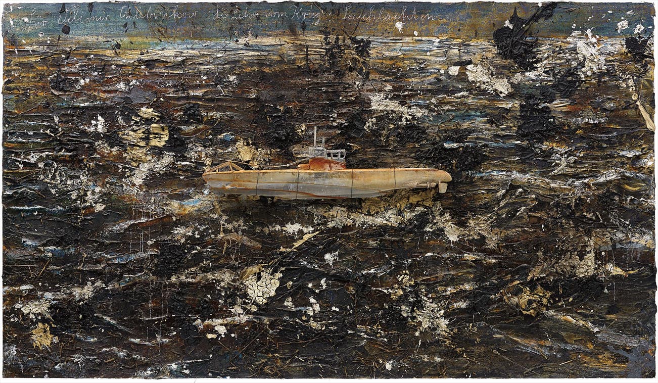 It is this desire that is explored by Kiefer, in addition to a greater question on the march of history. This canvas, heaving with matter, possesses the characteristic turbid and highly worked surface of the artist’s work. Heavy impasto layers of burnt umber, smoky charcoal and black, alive with unseen forces, surround a handmade lead submarine, perched precariously amidst the turbulent seas. The oceanic depths are neither cerulean nor serene, but opaque, thickly layered and encrusted, demonstrating the sea’s capacity for sudden and violent transformation. This sheer power echoes the scenes of Caspar David Friedrich’s 1824 The Polar Sea. A uniform sense of futility and isolation permeates the scene, as the submarine floats without any other object in sight, wandering almost aimlessly. There is a suggestion in this work, through its hidden depths, of the unknowable and our fundamental inability to predict the future.