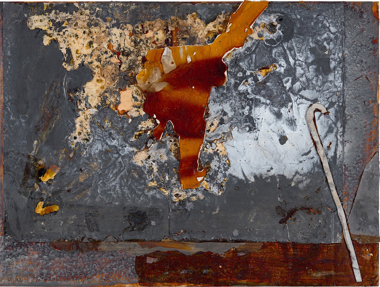 lead, shellac and acrylic on charred photographic paper, mounted to board