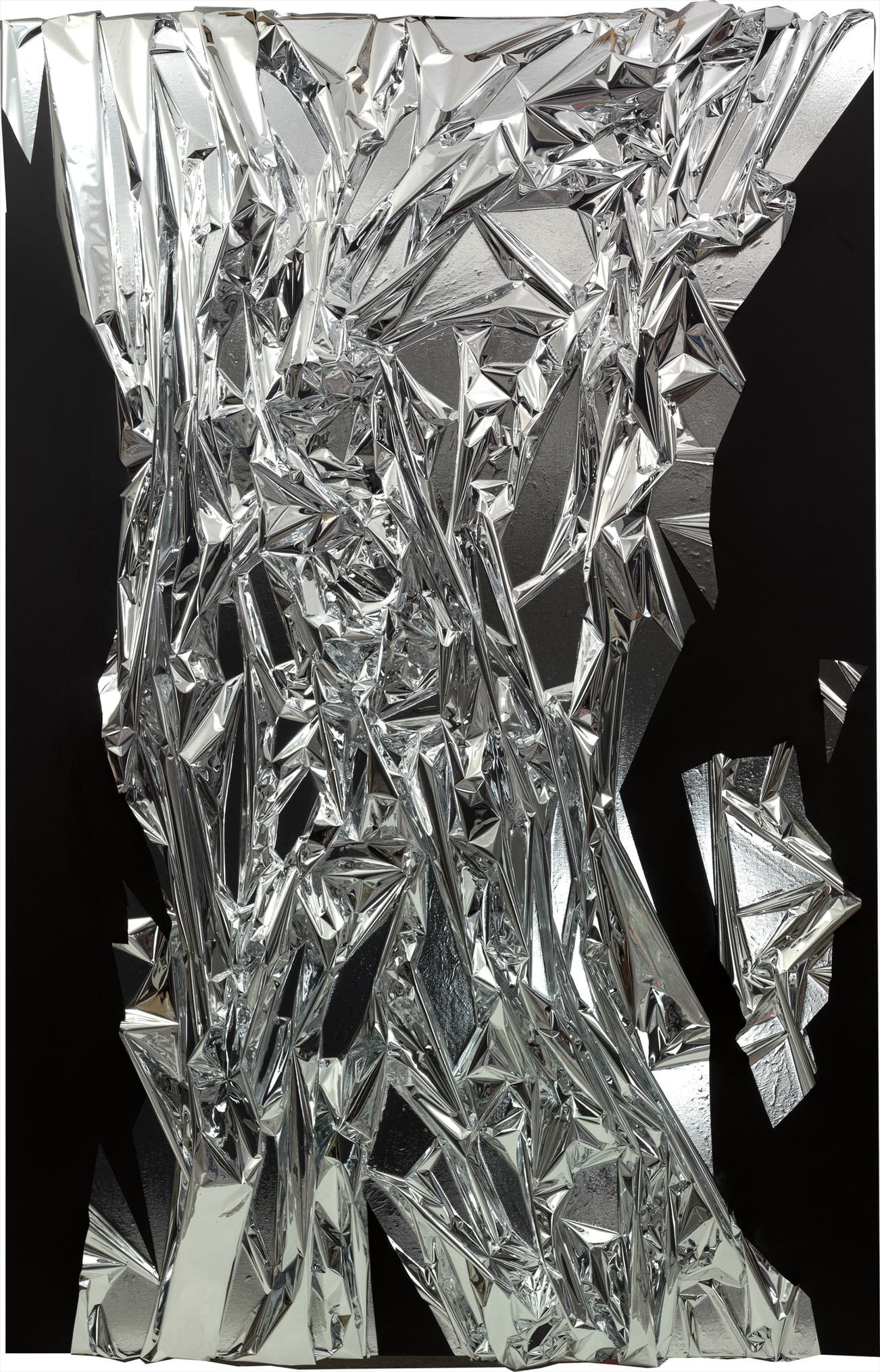 The present lot, Reyle’s Untitled from 2006, takes the familiar form of his foil paintings. Untitled towers almost ten feet in front of the observer, a goliath study in our tactile impulses. Trapped within the seven-inch thick box, his PVC foil is observable from all angles for the viewer’s maximum enticement, yet guarded by its Plexiglas enclosure. The canvas on which Reyle mounts his work functions simultaneously as a surface and a foundational structure, similar to the collage-style works of Reyle’s predecessors Robert Rauschenberg and Jasper Johns. But Reyle also adds a fourth dimension to his work, detailing various recessions within the PVC foil with black acrylic. In doing so, the viewer finds difficulty in differentiating the negative space of Reyle’s black paint from the reflective surfaces of his sculpture. The occasional sharp corners of the foil alternate with smooth curvatures elsewhere, begetting a surface pattern that resembles the drapery work of the past two millennia. Anselm Reyle’s work is as pleasurable for the eyes as it is frustrating for our outstretched fingers; a modern masterpiece that both attracts and rebukes us.