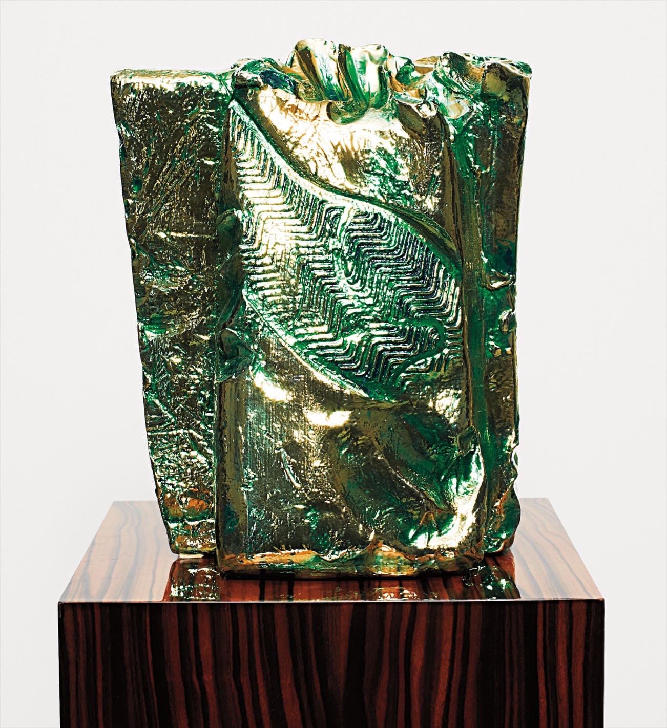 bronze, chrome, enamel, varnish on veneered makassar wood plinth