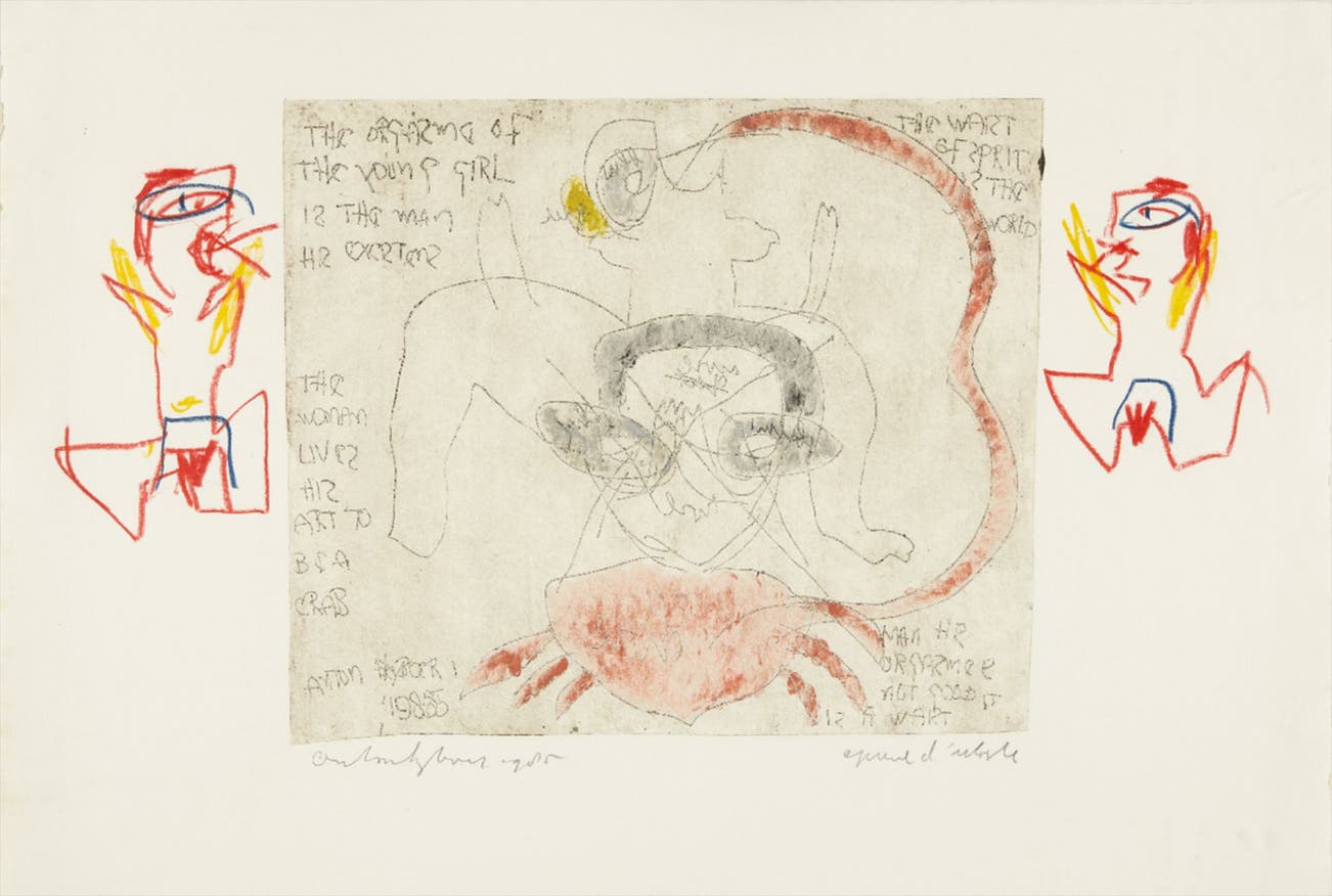 Etching with hand-coloring and unique drawings in colored crayon in the margins, on wove paper with globe watermark, with full margins,