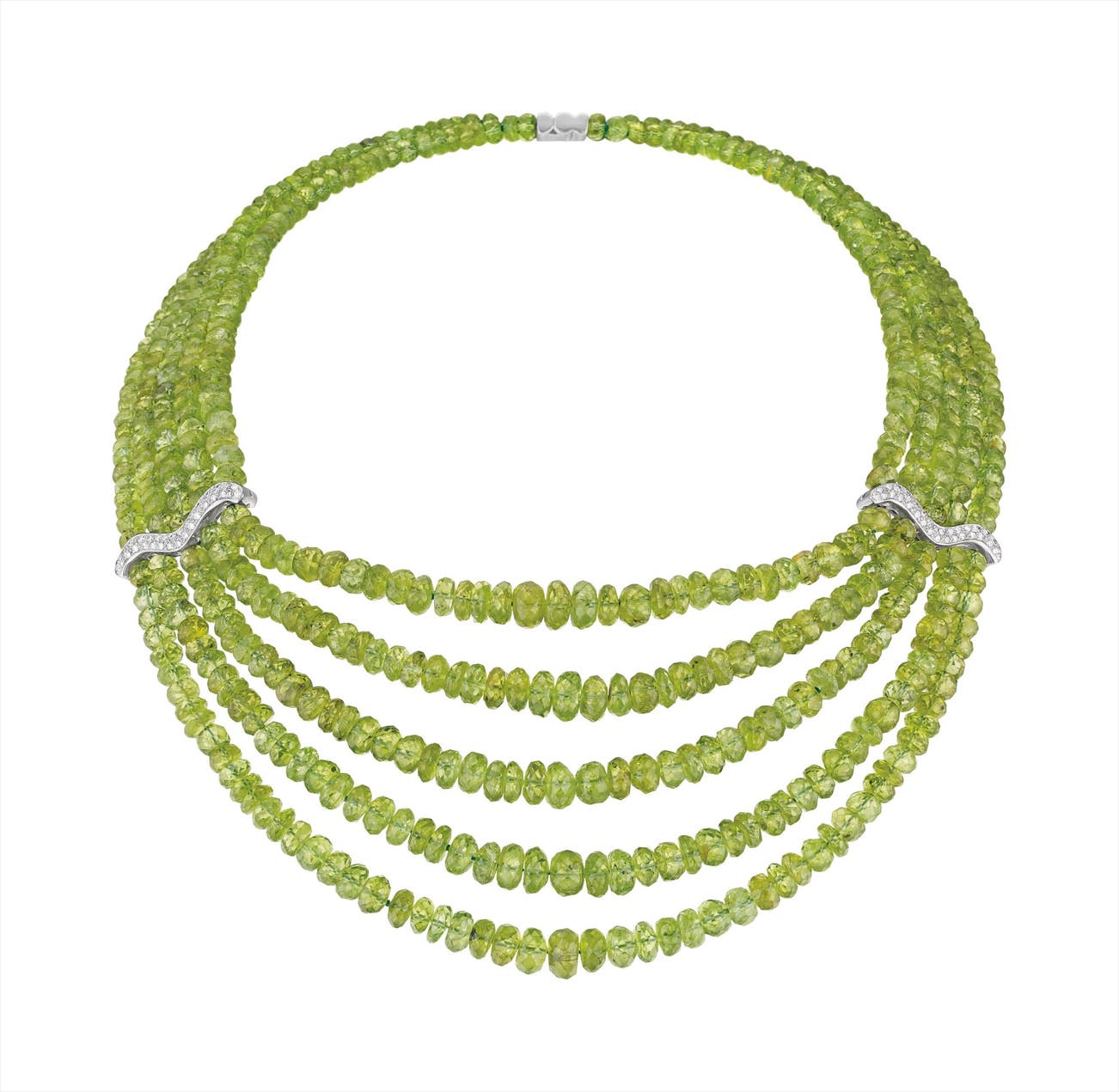 Designed as five rows of peridot beads, accented by two pavé-set diamond links, mounted in 18K white gold, length 17.5 to 22 inches.