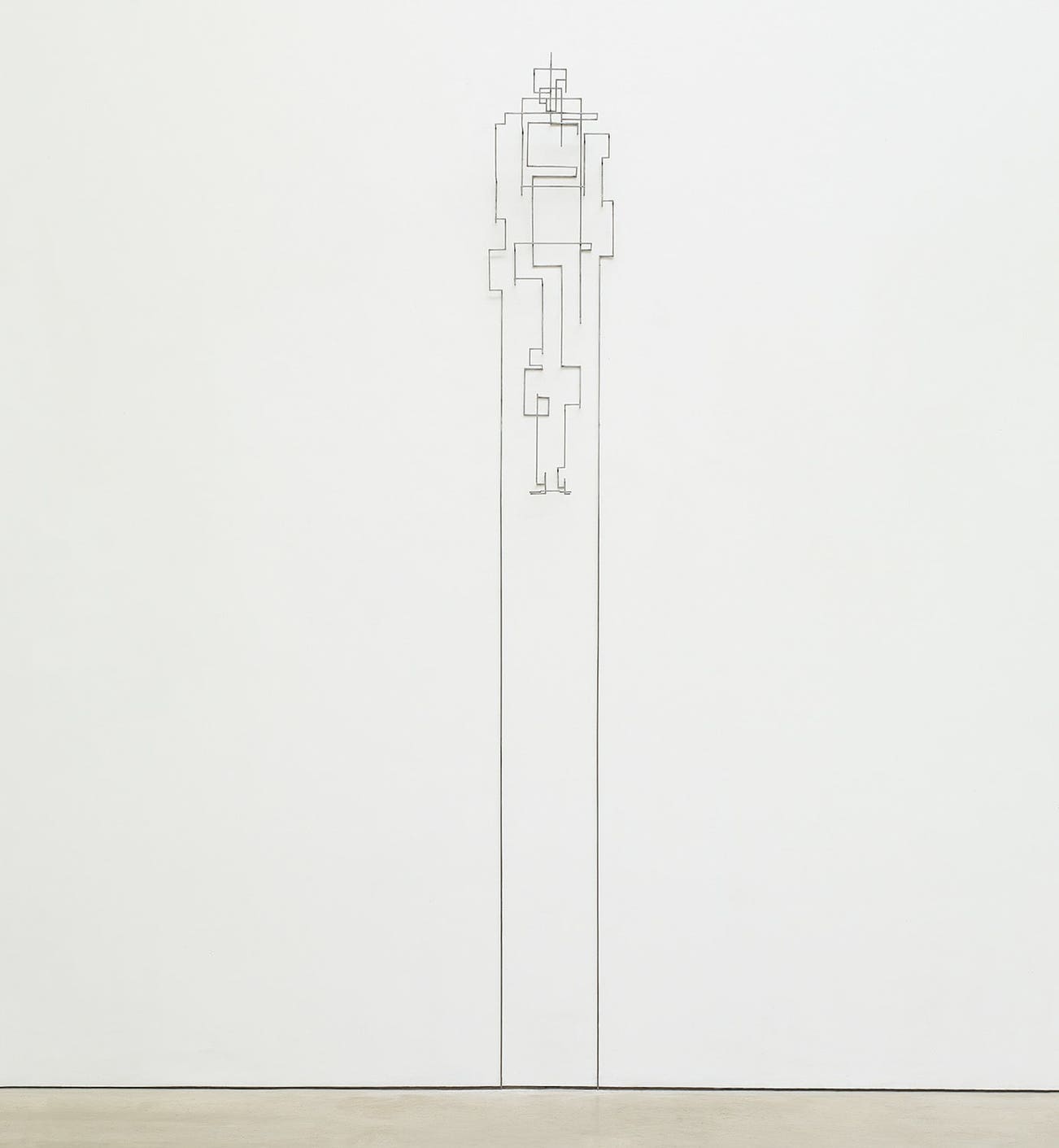 In reflecting upon the importance of line in his work, Gormley cites Paul Klee’s Pedagogal Sketchbook (published in 1925), as a source of inspiration. In this book, Klee discusses the notion of active line, limited in its movement by fixed points, versus passive line, the result of an activation of planes. Klee ultimately postulates that every line has an intrinsic energy. In Lift III, Gormley draws upon these tenets, yet transforms the notion of line on paper into a three-dimensional, tangible form. For Gormley, the wall becomes paper – a blank canvas on which he can explore the infinite possibilities of line in space. In Lift III, the steel rod takes a very deliberate path; there is a palpable intensity where it meets the wall, and a series of calculated pressure points at every 90-degree turn. Gormley transforms something as simple as a line into a charged sculpture that invites the viewer to reflect on his or her own being in space.