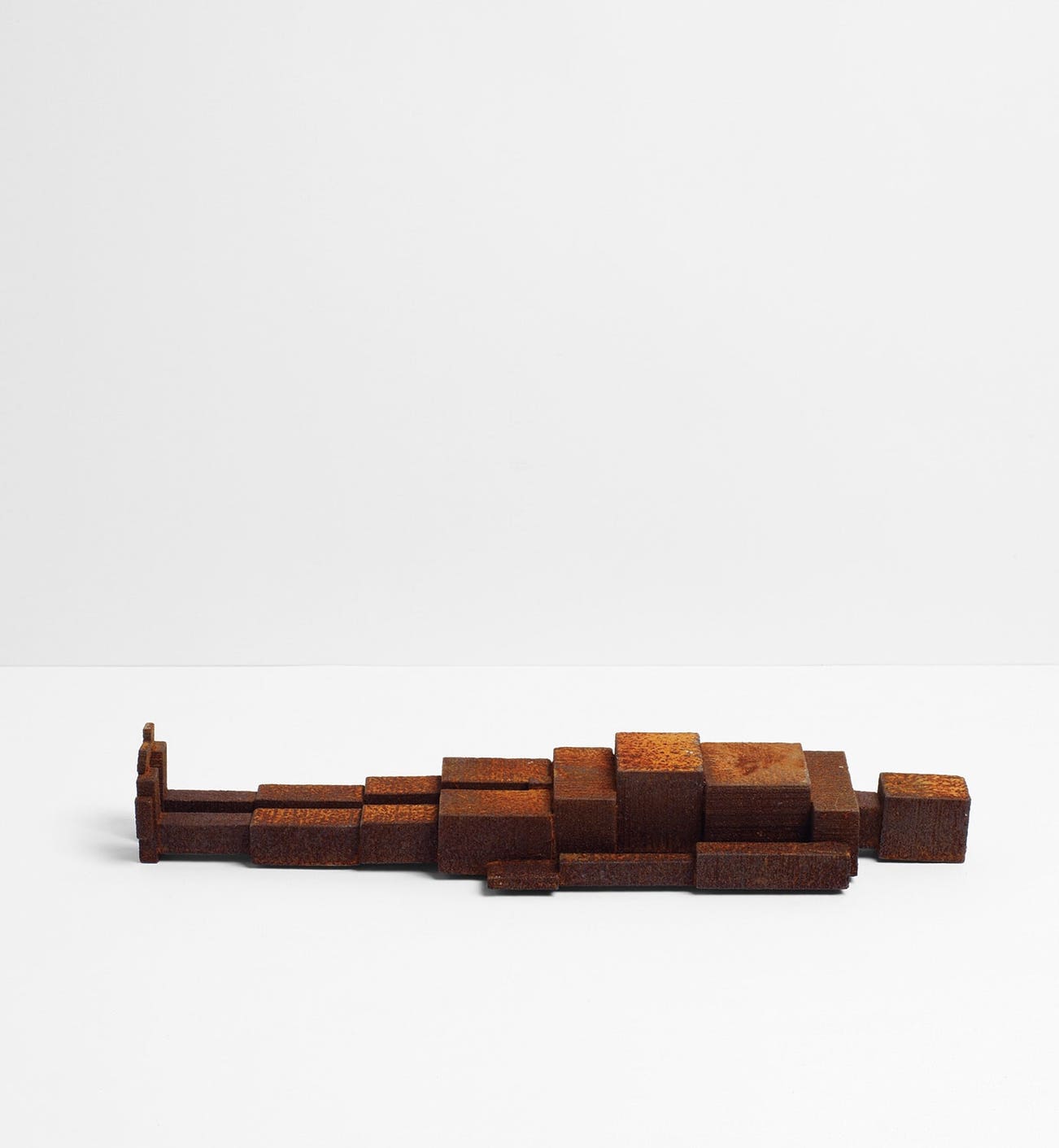 These small solid iron works use a geometric formal language of 27 blocks to articulate a range of 33 body postures. The ambition is to make intelligible forms that form an abstract lexicon of body-posture but which nevertheless carry the invitation of empathy and the transmission of states of mind.