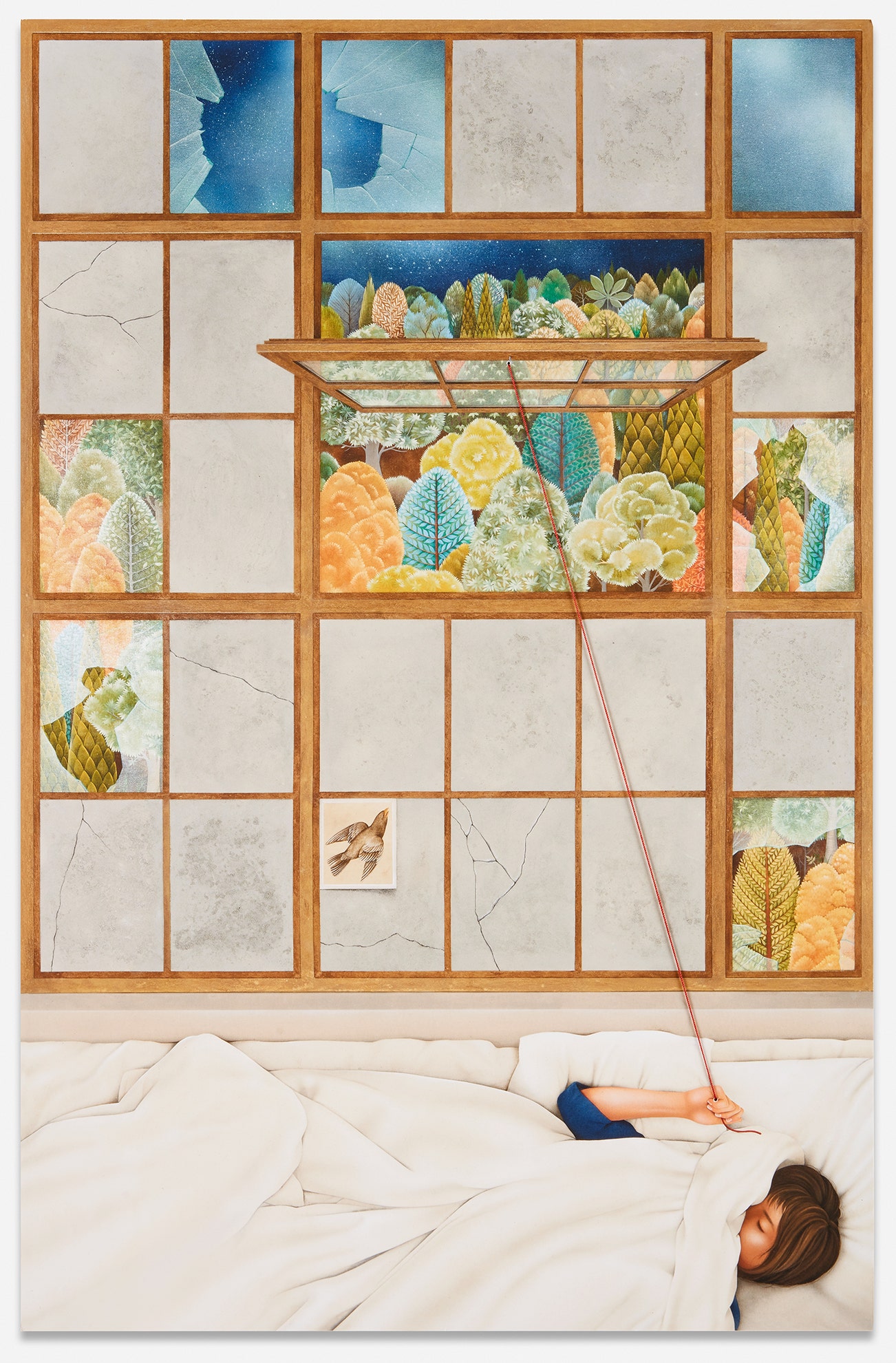 Pigment print in colors, on Hahnemühle paper mounted to aluminum panel, with wax finishing and red thread, affixed to the original artist's glazed alder wood frame.