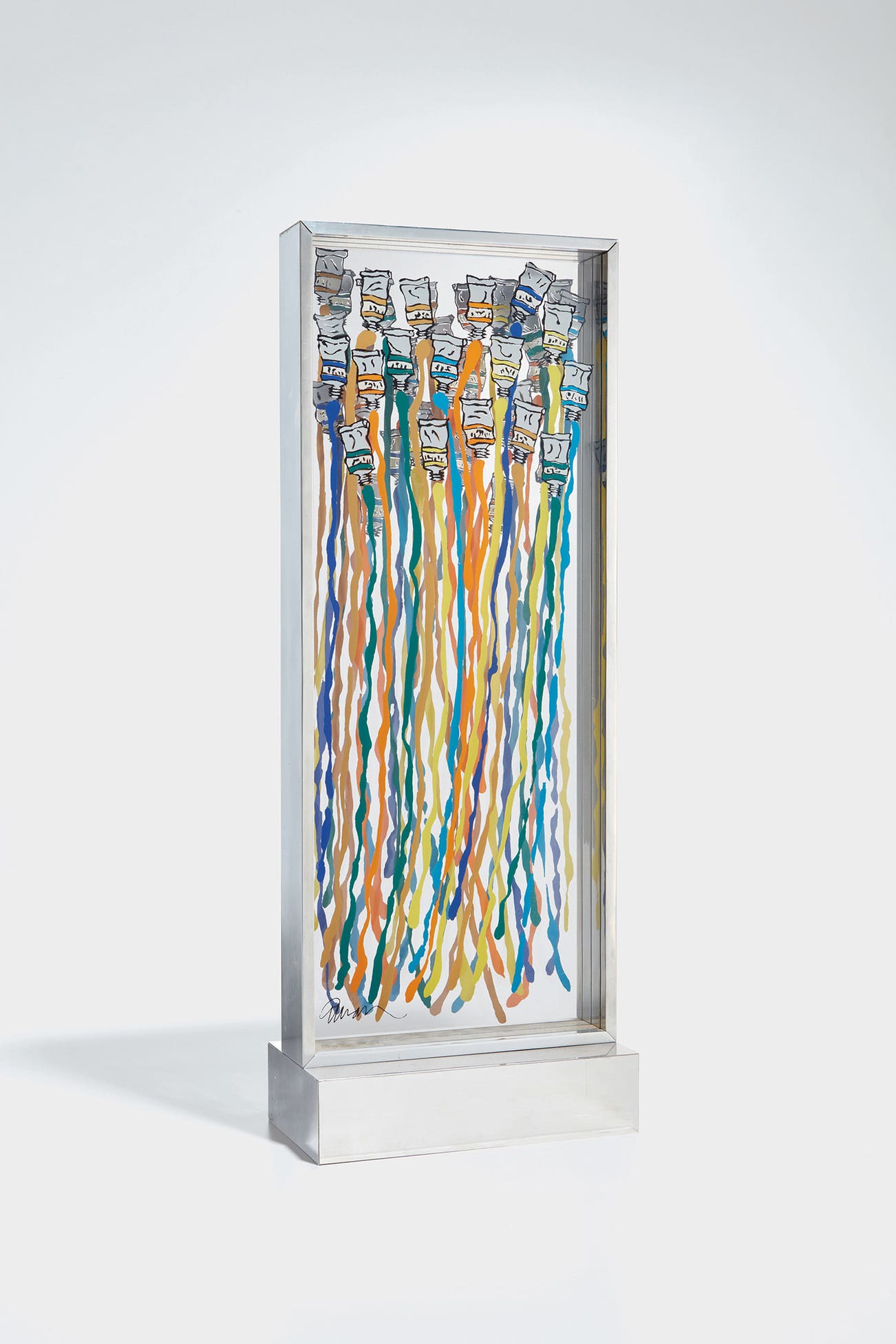 Screenprint in colors on three sheets of Plexiglas, all framed together with standing base.