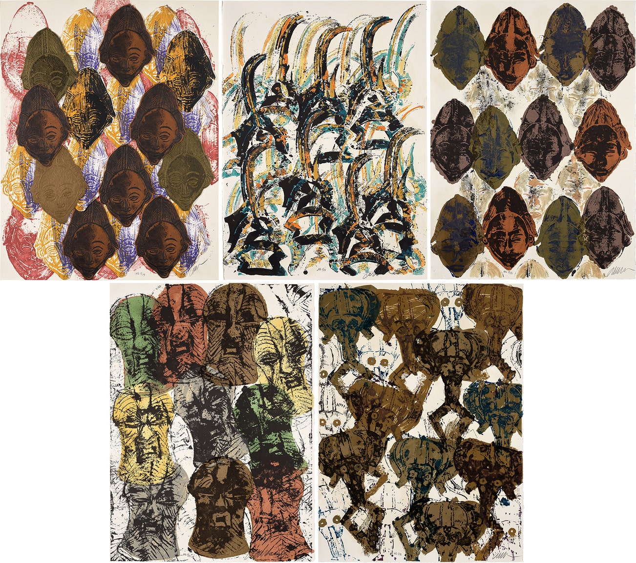 The complete set of four lithographs in colors, on Rives BFK paper, the full sheets, with justification and text in French by Tita Reut, all contained in the original white cloth-covered portfolio with collage of lithographs on the front.
