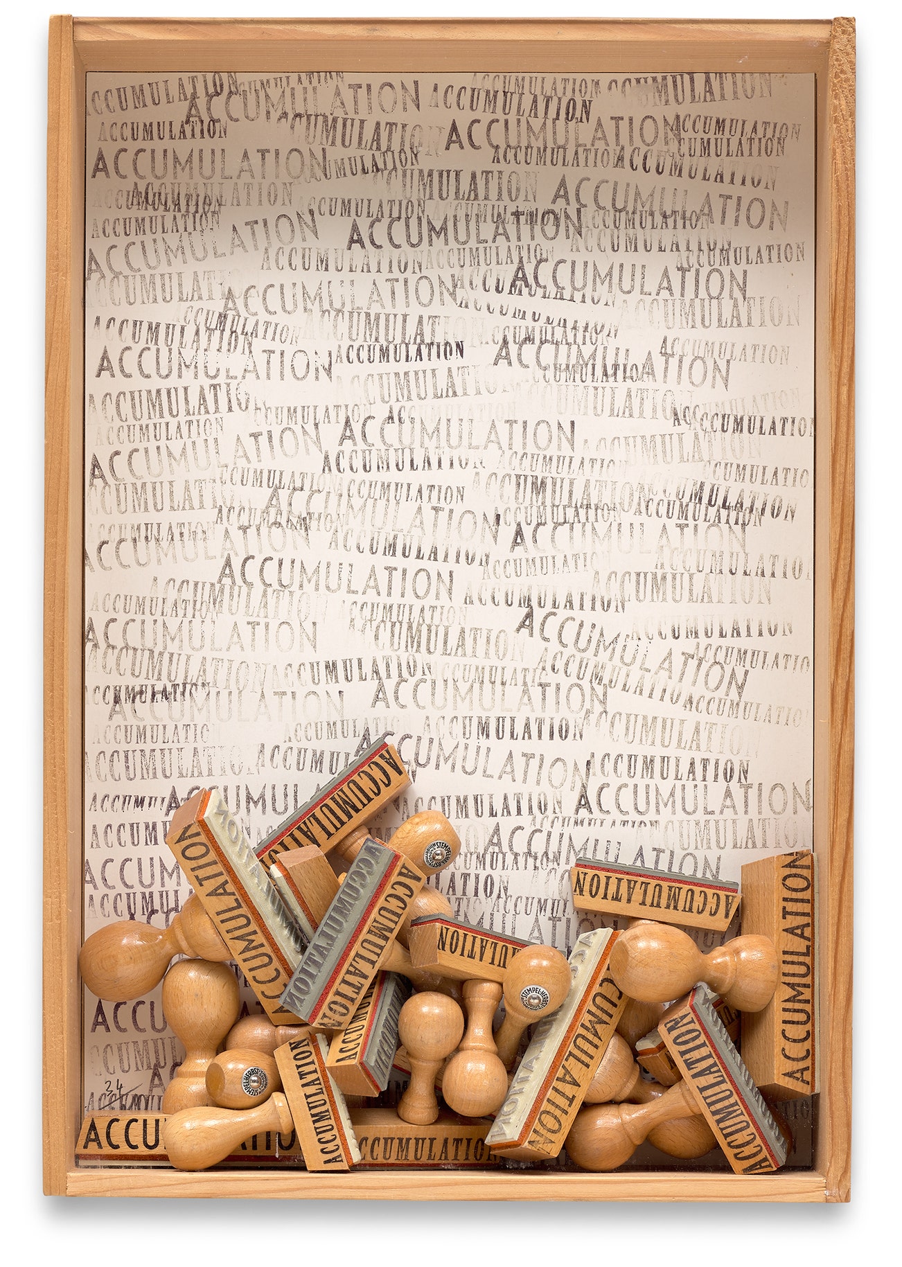 Multiple comprised of rubber stamps and paper, contained in a wooden box with Plexiglas lid.