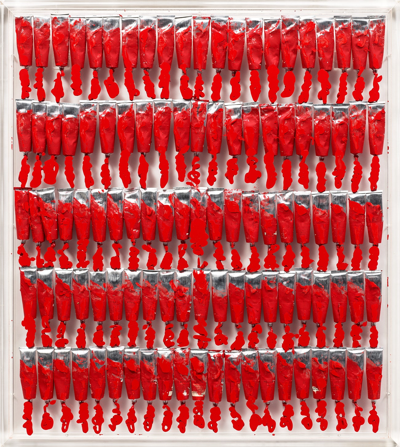 five horizontal rows of Cadmium Red Medium acrylic paint with tubes embedded in polyester resin, encased in Plexiglas