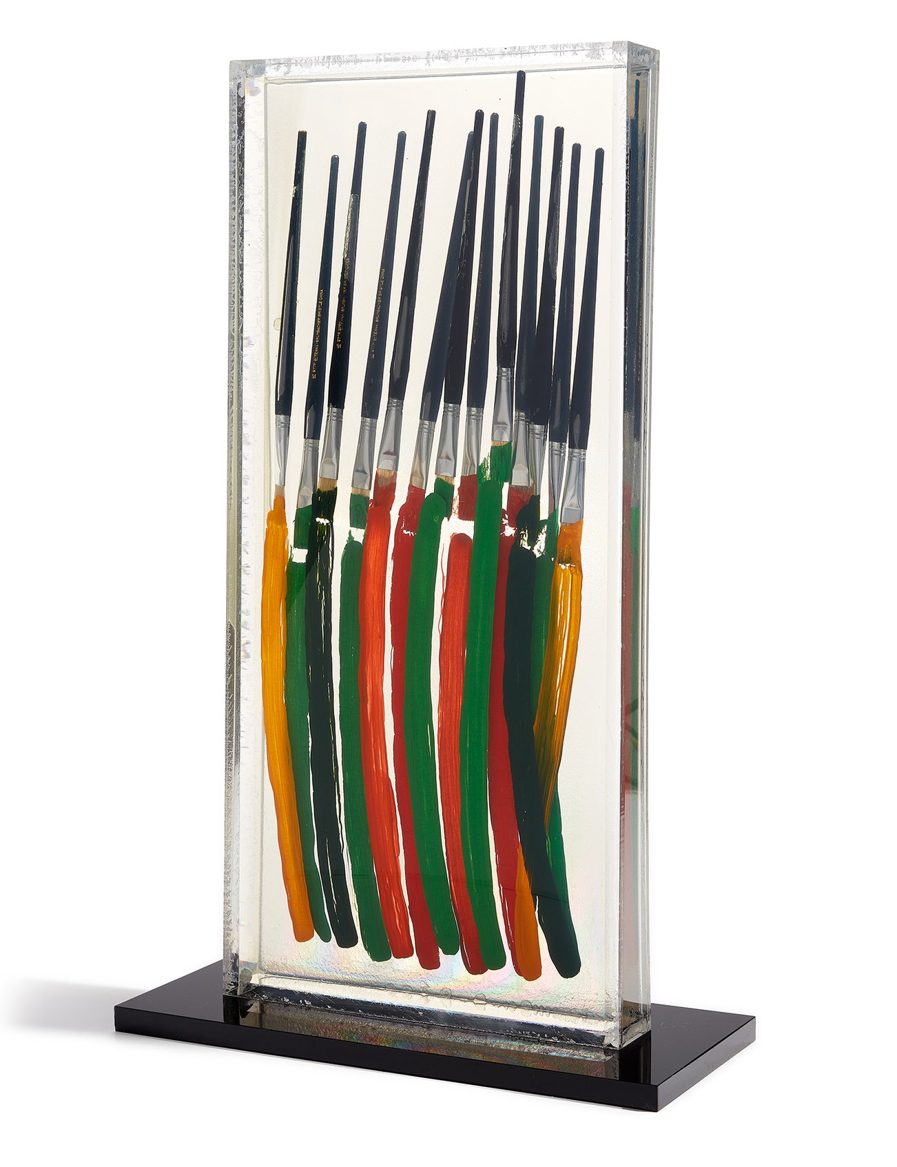 accumulation of paint brushes and acrylic in polyester, encased in Plexiglas