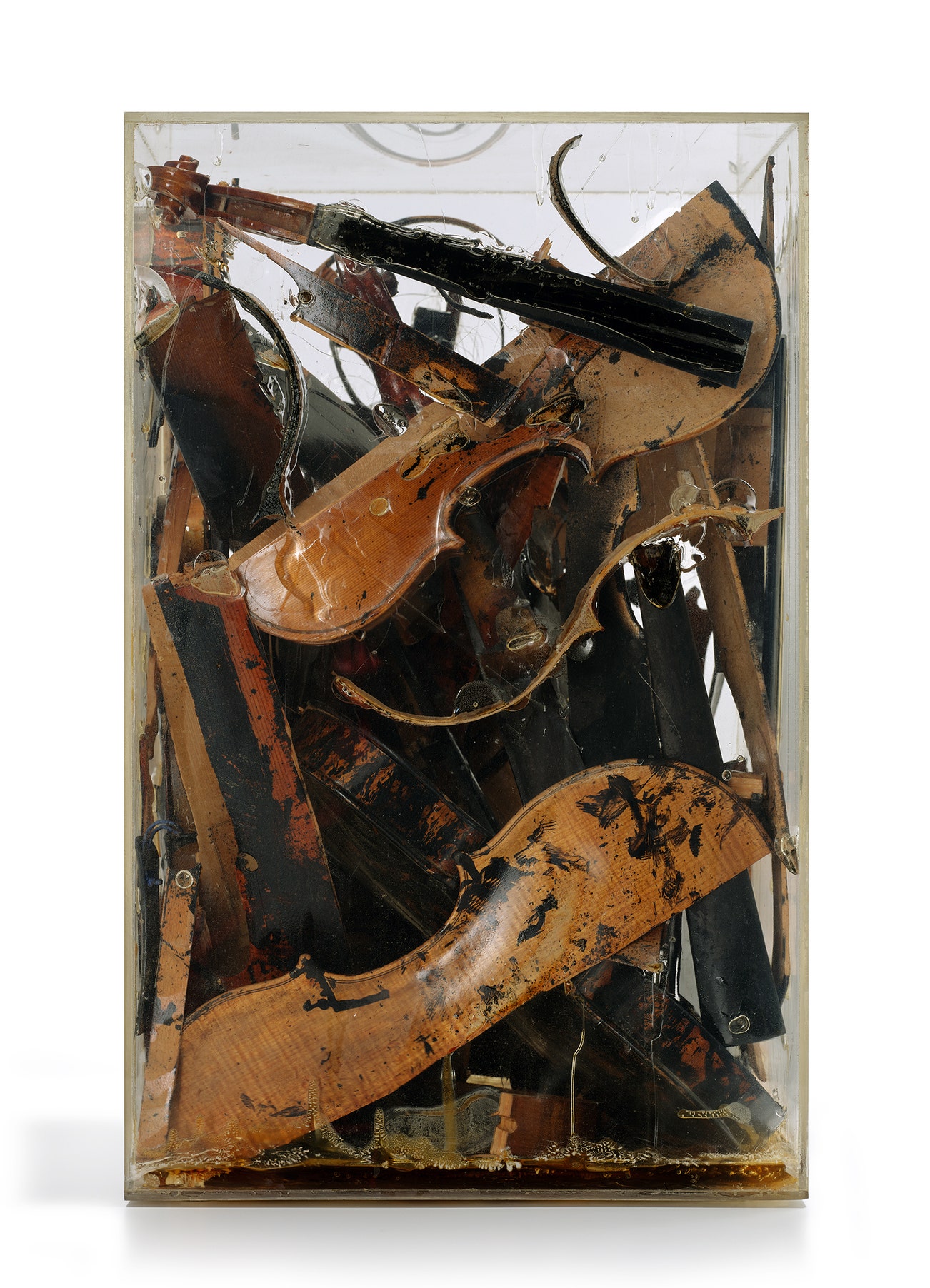 accumulation of burned and broken violins encased in Plexiglas box