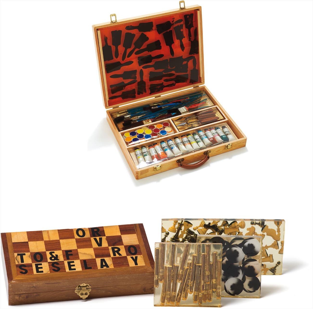 Two works, including one complete set comprised of a wooden box containing four accumulations of artist’s materials in polyester, two screenprints on Plexiglas, one offset lithograph on Rives BFK paper, and one etching on Arches paper, the full sheets or with full margins, and one set of three accumulations of sliced chess pieces, cigars, and photographs embedded in Plexiglas, in a portable chess board box made of wood,