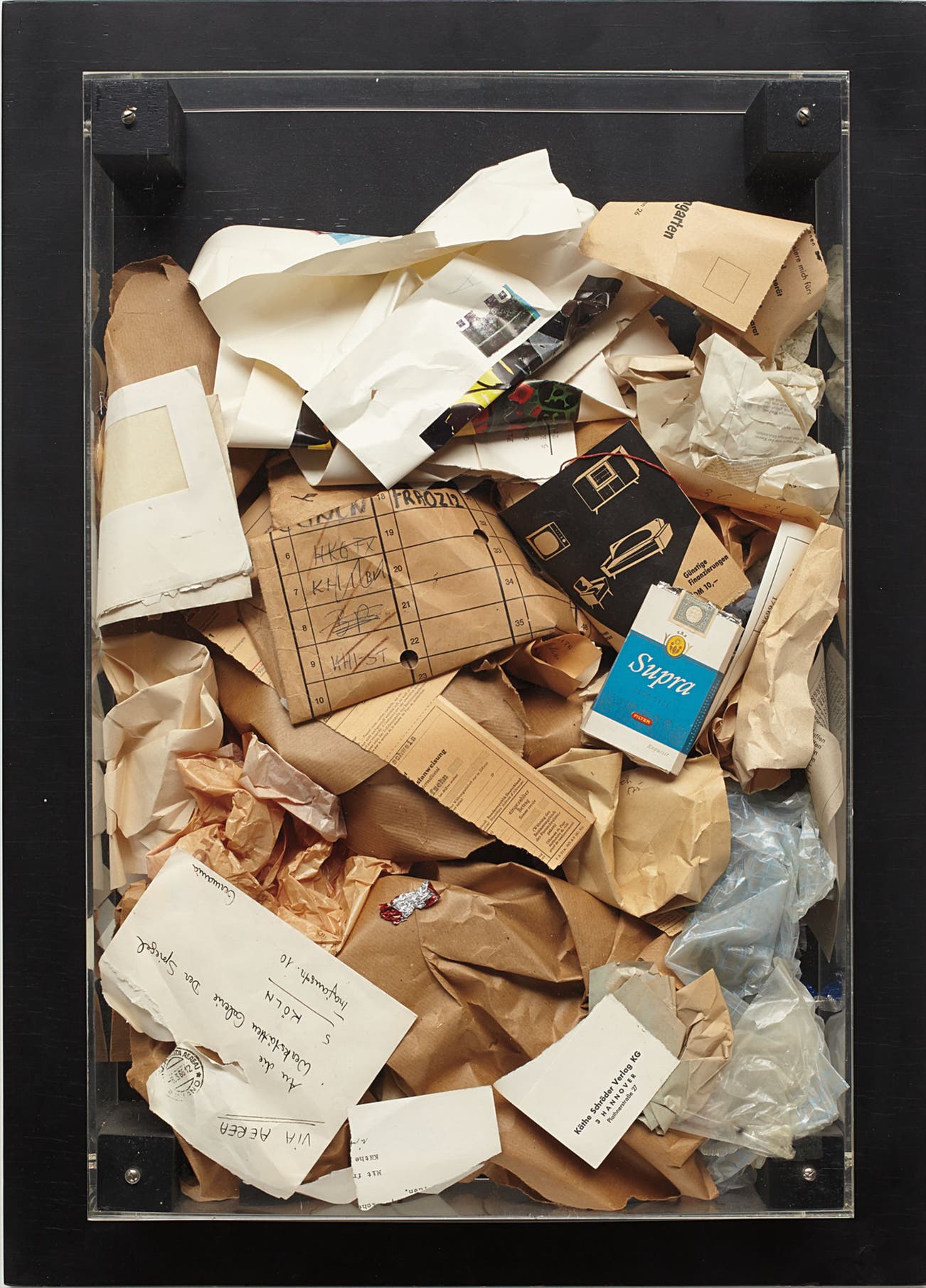 Paper refuse in Plexiglas box mounted on black wood panel (as issued),