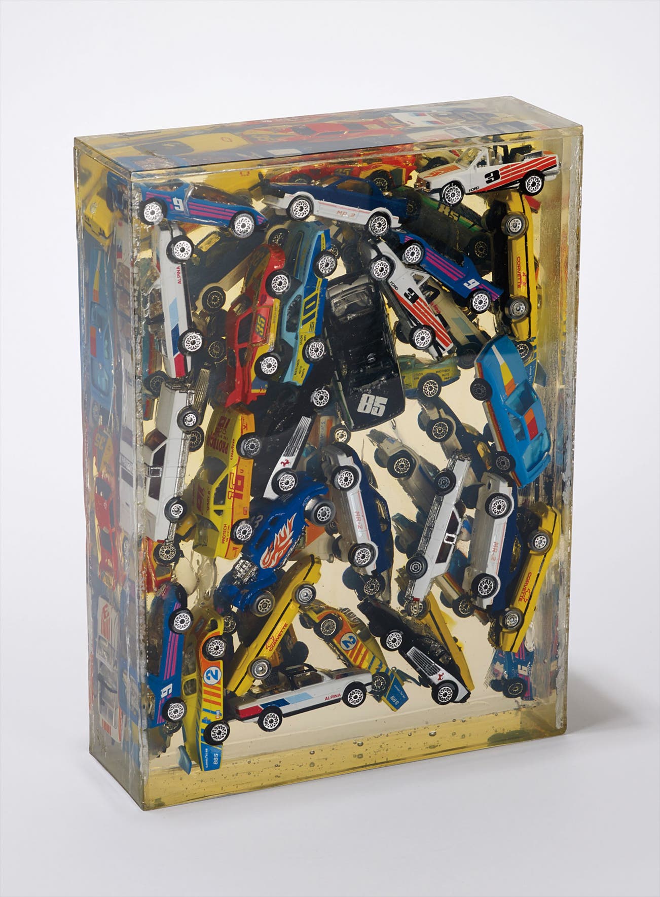 Accumulation of multi-colored toy cars embedded in polyester resin encased in plexiglas,