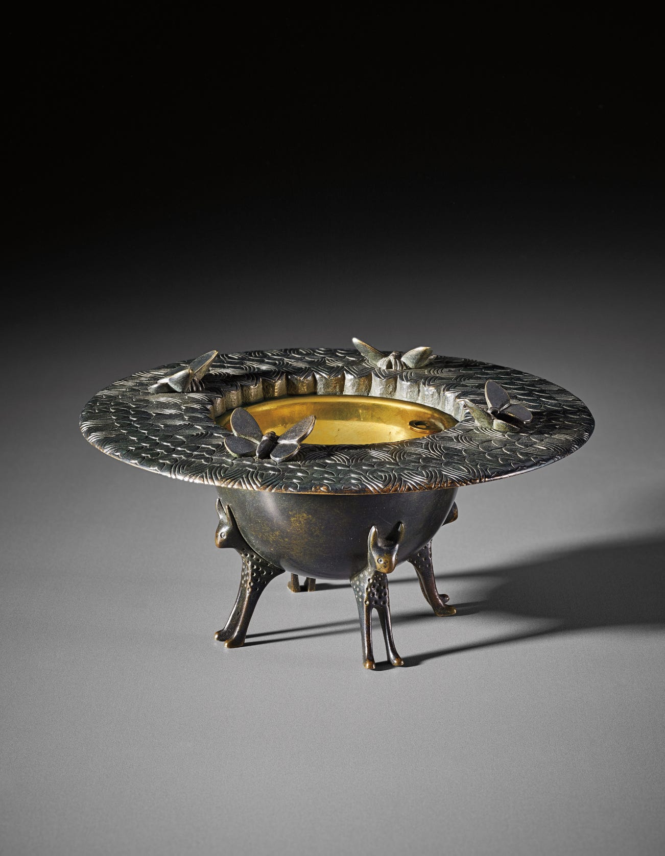 At the turn of the twentieth century, Armand-Albert Rateau traveled from France to the sites of eighteenth-century archaeological excavations in Pompeii, Italy. This moment, coupled with the excitement over the opening of Tutankhamen’s tomb, resulted in his ultimate taste for classical antiquity that would later make his name in the 1920s. The present ornamental ashtray is a strong illustration of Rateau’s innovative style combining classical art, embellished creatures, and a flair for precious materials. The fanciful ornamentation of butterflies and feline creatures creatively combines fantasy and classicism. His interest in classical art and Egyptian motifs is executed in bronze and brass with both sobriety and exuberance. This distinctive elegance, inspired by stylized nature reminiscent of the East and Antiquity, appealed to the contemporary fashion for exotic themes and luxurious materials.