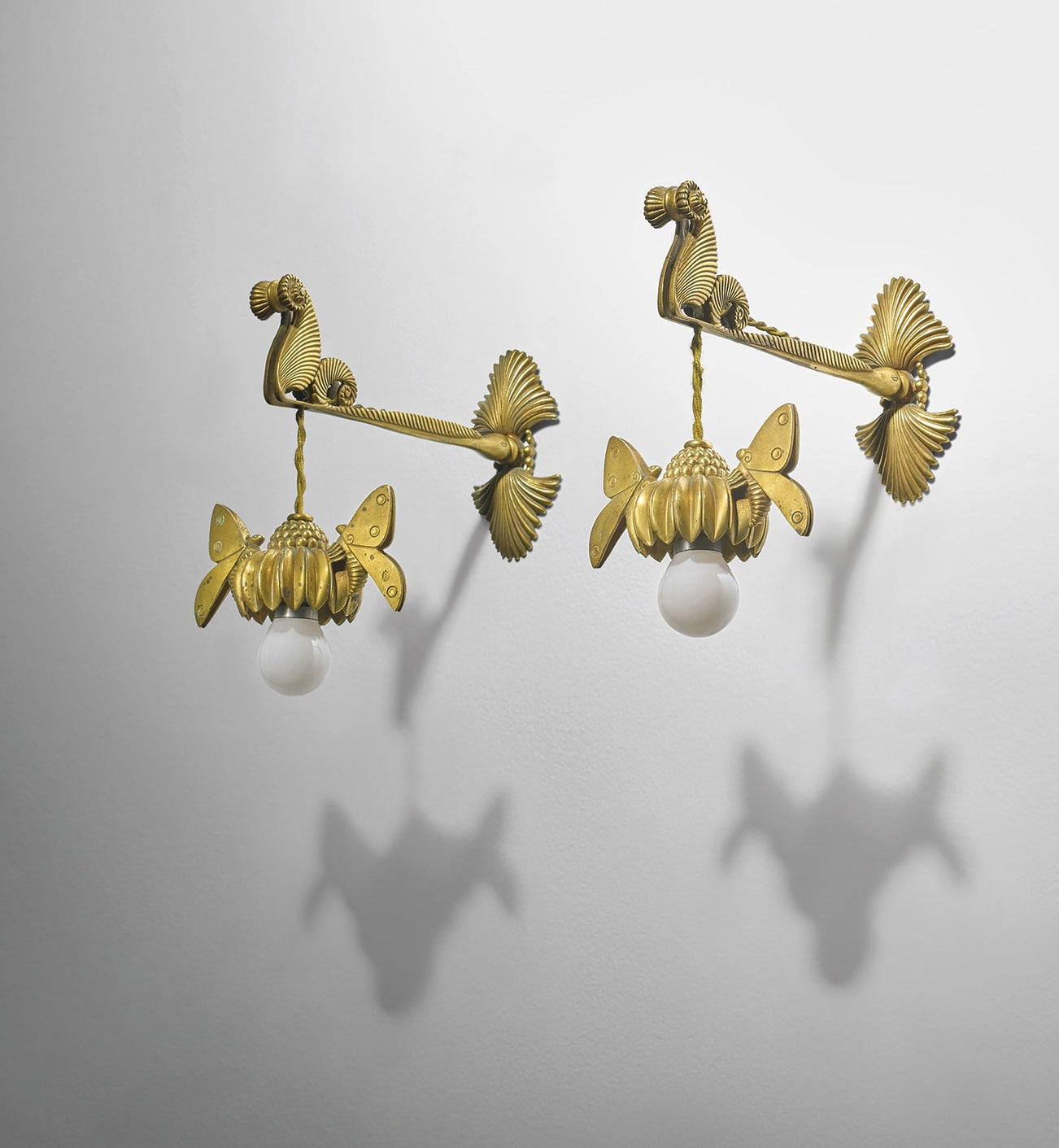 The present pair of wall lights designed by Armand-Albert Rateau combines overt symmetry with the freedom of fantasy, inspired by classical antiquity and nature. Characteristic of the designer’s highly individual interpretation of neoclassicism during the 1920s, Rateau integrated stylised daisies, acanthus and palm leaves into the structure of the wall lights, which are executed in bronze — a material used extensively during antiquity and for which Rateau’s work also became closely associated. A decade earlier, Rateau had visited the excavated ancient Roman city of Pompeii with its preserved frescoes, including elaborate, decorative garden and landscape scenes, as well as visited the nearby archaeological museum in Naples that housed examples of ancient bronze furniture. These influences are evident in the present design, which is evocative of this classical past yet unmistakably modern. Perched on either side of the suspended flower, Rateau balanced a butterfly as if found in nature, further enlivening the gilded bronze surface, which is enhanced by an exposed light bulb. The design was produced by Maison Baguès, Paris, an atelier celebrated for their finely casted bronze lighting, and who expanded alongside late nineteenth and early twentieth-century advancements in electricity.