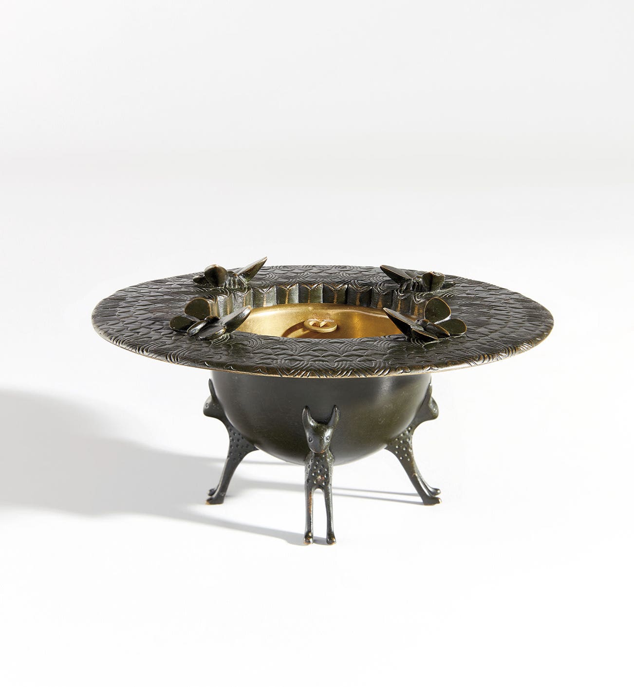 At the turn of the 20th century, Armand-Albert Rateau traveled from France to the sites of eighteenth-century archaeological excavations in Pompeii, Italy. This moment, coupled with the excitement over the opening of Tutankhamen’s tomb, resulted in his ultimate taste for classical antiquity that would later make his name in the 1920s. The present ornamental ashtray is a strong illustration of Rateau’s innovative style combining classical art, embellished creatures, and a flair for precious materials. The fanciful ornamentation of butterflies and animals creatively combines fantasy and classicism. His interest in classical art and Egyptian motifs is executed in bronze and brass with both sobriety and exuberance. This distinctive elegance, inspired by stylized nature reminiscent of the East and Antiquity, appealed to the contemporary fashion for exotic themes and luxurious materials. It is fitting, then, that the present model ashtray was displayed at the 1925 Exposition Universelle in Paris and subsequently at The Metropolitan Museum of Art's 1926 exhibition of decorative arts from the exposition.