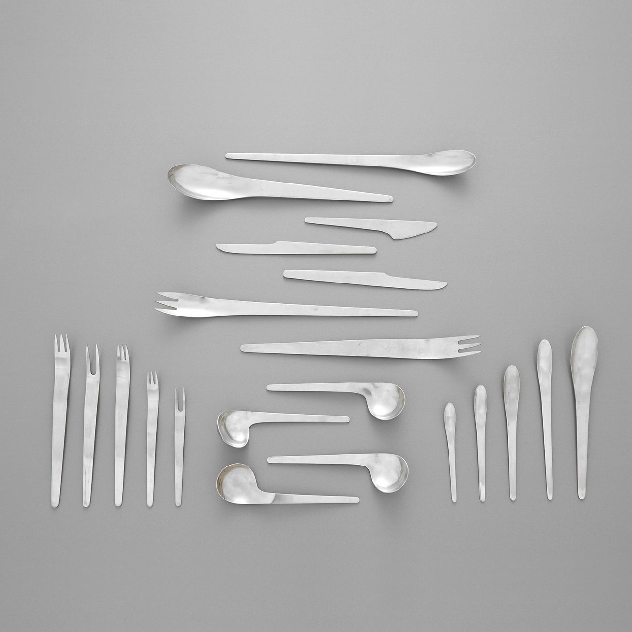 Produced by A. Michelsen, Copenhagen, Denmark. Each impressed A. MICHELSEN/STAINLESS/DENMARK and with designer's monogram. Comprising 24 dinner forks, 24 salad forks, 24 dessert forks, 4 cold meat forks, 4 lemon forks, 24 dinner knives, 24 salad knives, 24 butter knives, 24 soupspoons, 24 right-hand bouillon spoons, 4 left-hand bouillon spoons, 24 dessert spoons, 24 ice tea spoons, 24 teaspoons, 24 coffee spoons, 24 espresso spoons, 12 serving utensils (336 pieces).