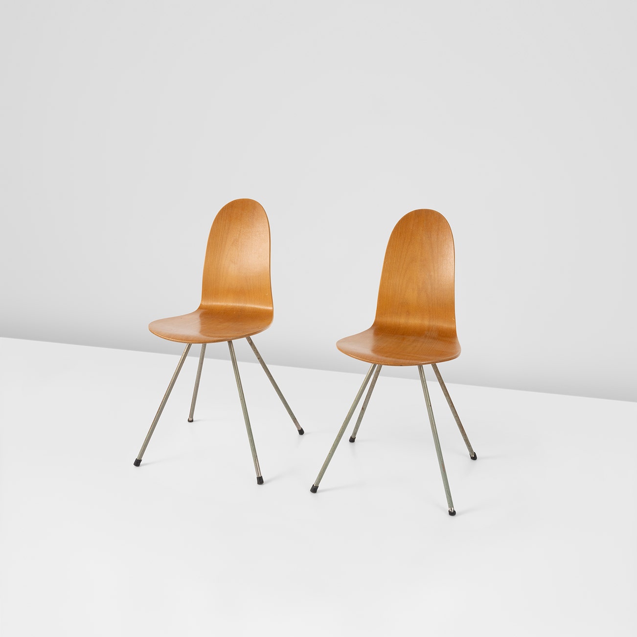 Manufactured by Fritz Hansen, Denmark. Underside of each chair impressed with manufacturer's logo and DANMARK.