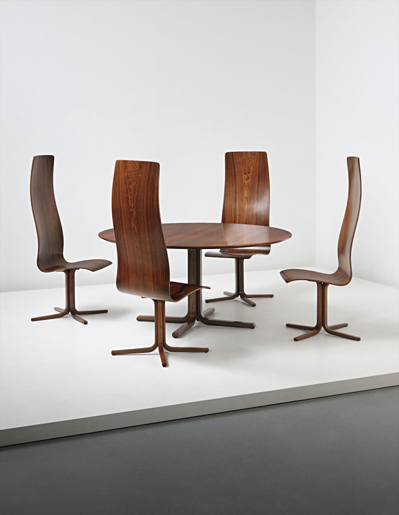Each chair: rosewood-veneered moulded plywood, bent laminated rosewood; table: rosewood-veneered plywood, bent laminated rosewood.