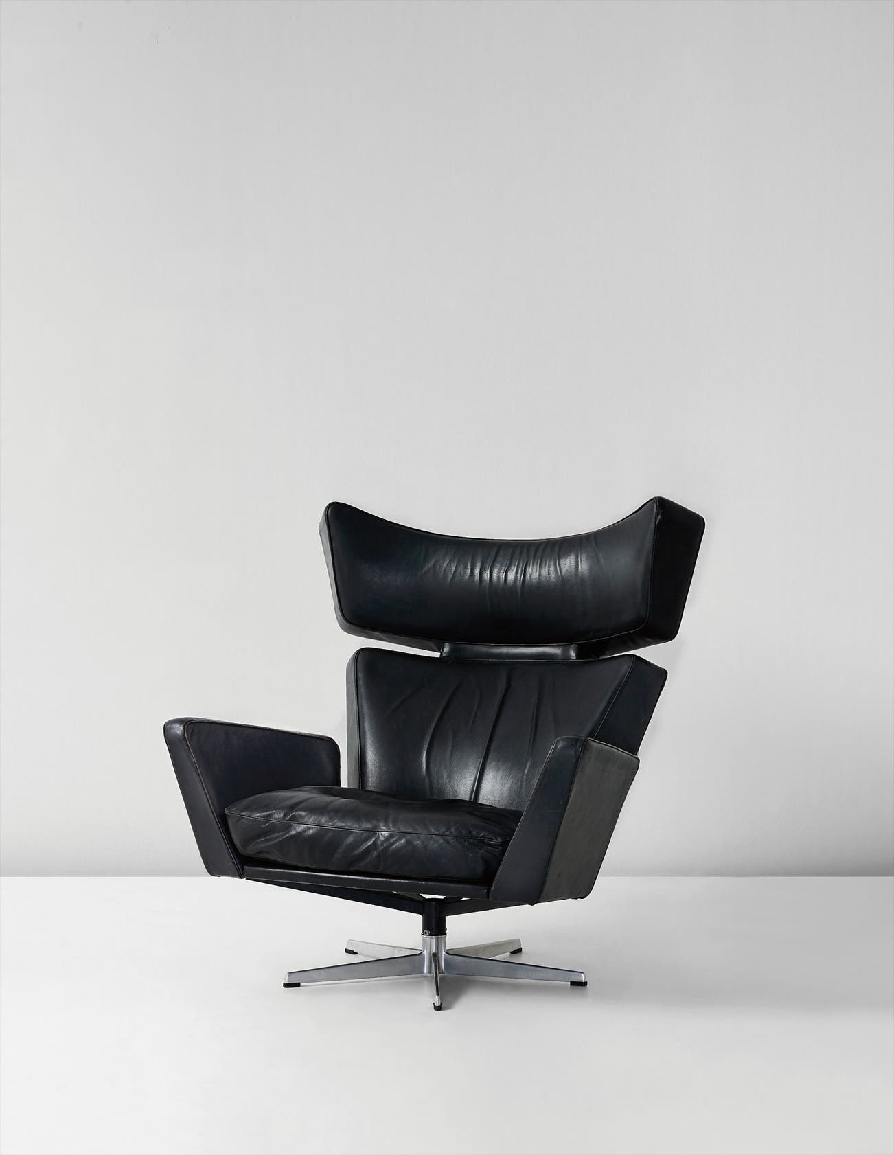 Manufactured by Fritz Hansen, Denmark. Underside of chair with manufacturer's printed logo FH and MADE IN DENMARK 6604 BY FRITZHANSEN and Danish Furniture makers control logo.