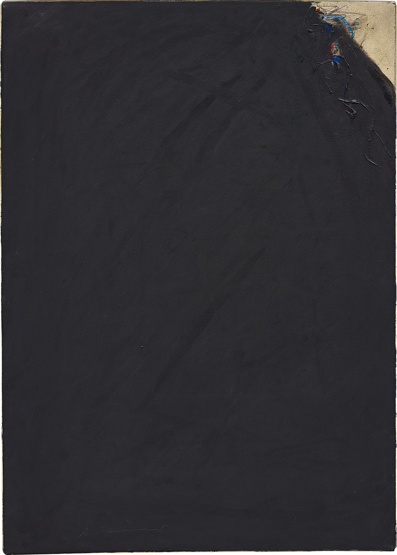 Rainer’s ‘rest corner’ paintings such as Übermalung mit Ecke (Overpainting with corner) are usually painted and re-worked over the course of many years: ‘Today, being preoccupied with other artistic problems, I continue working on these pieces — at least the ones I still own — with an average of one brush stroke a month. Until my demise they will continue to change considerably, i.e. they will grow denser and denser, until only small patches of white remain, edges or corners, perhaps not even these’ (Arnulf Rainer, quoted in Arnulf Rainer: Early Work, exh. cat., Galerie Thaddaeus Ropac, London, 2017, p. 171). Upon close observation, hints of blue, green and red peek through from behind the black at the top right corner, hinting at the once existing colourful underpainting that Rainer gradually covered. The intentional blank corners of these paintings leave the composition open and unfinished, which suggest an artistic practice that is an ‘inchoate process that defies completion’ (Arnulf Rainer: Retrospektive, exh. cat., MMKK – Museum Moderner Kunst Kärnten, Cologne, 2008, p. 20).