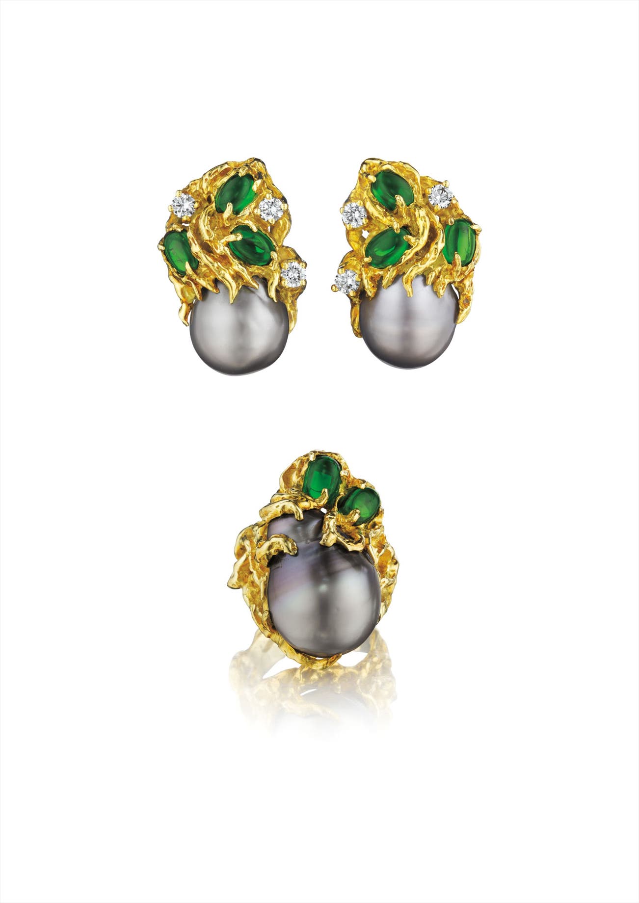 Comprising a pair of earclips, each set with a baroque cultured pearl, to the textured gold surmount accented by circular-cut diamonds and cabochon tourmaline; a similarly designed ring en suite, mounted in 18K yellow gold, earclips length 1 inch, ring size 4 1/2.
