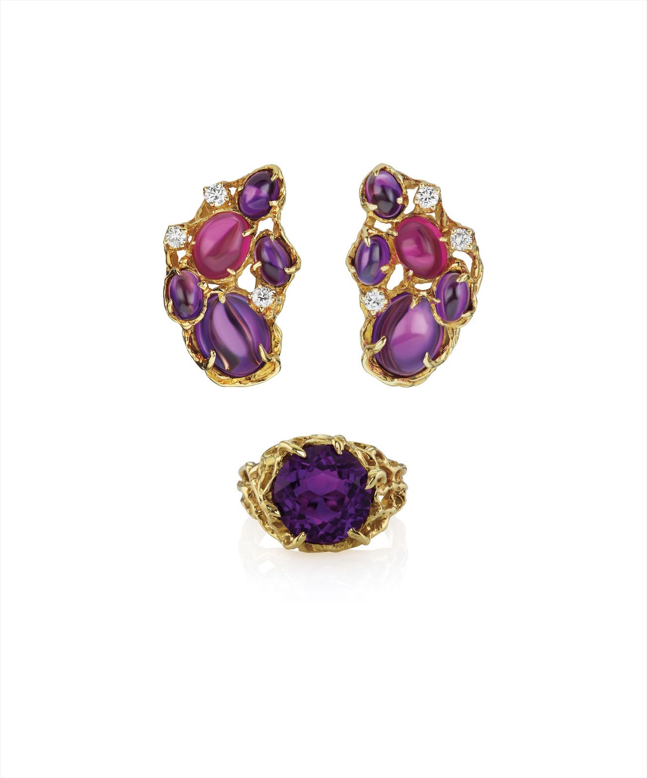 Designed as a cluster of cabochon amethysts, tourmaline, and circular-cut diamonds, set within a textured gold frame; a circular-cut amethyst ring en suite, mounted in 18K yellow gold, earclip length 1 inch, ring size 5 1/2.