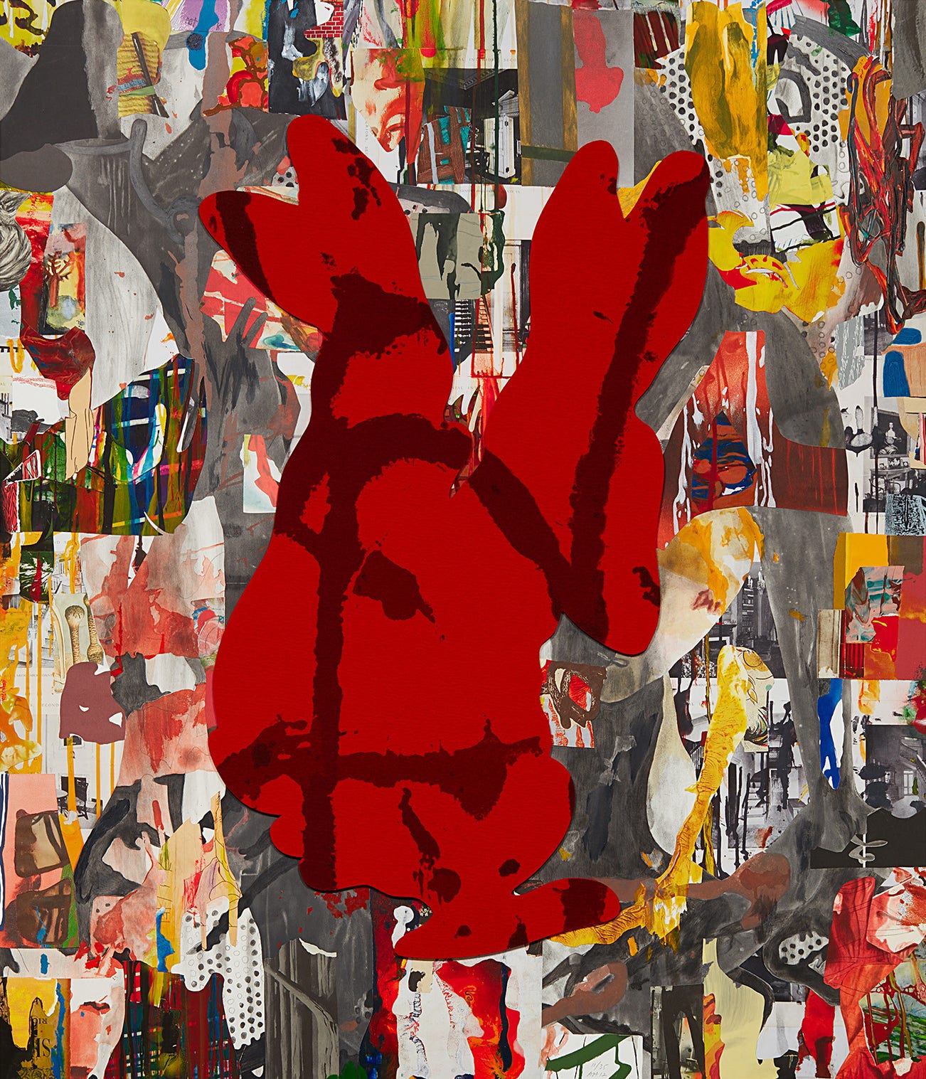 Screenprint, etching, relief, pochoir, collagraph and digital pigment printing with felt in colors, on wove paper, the full sheet.
