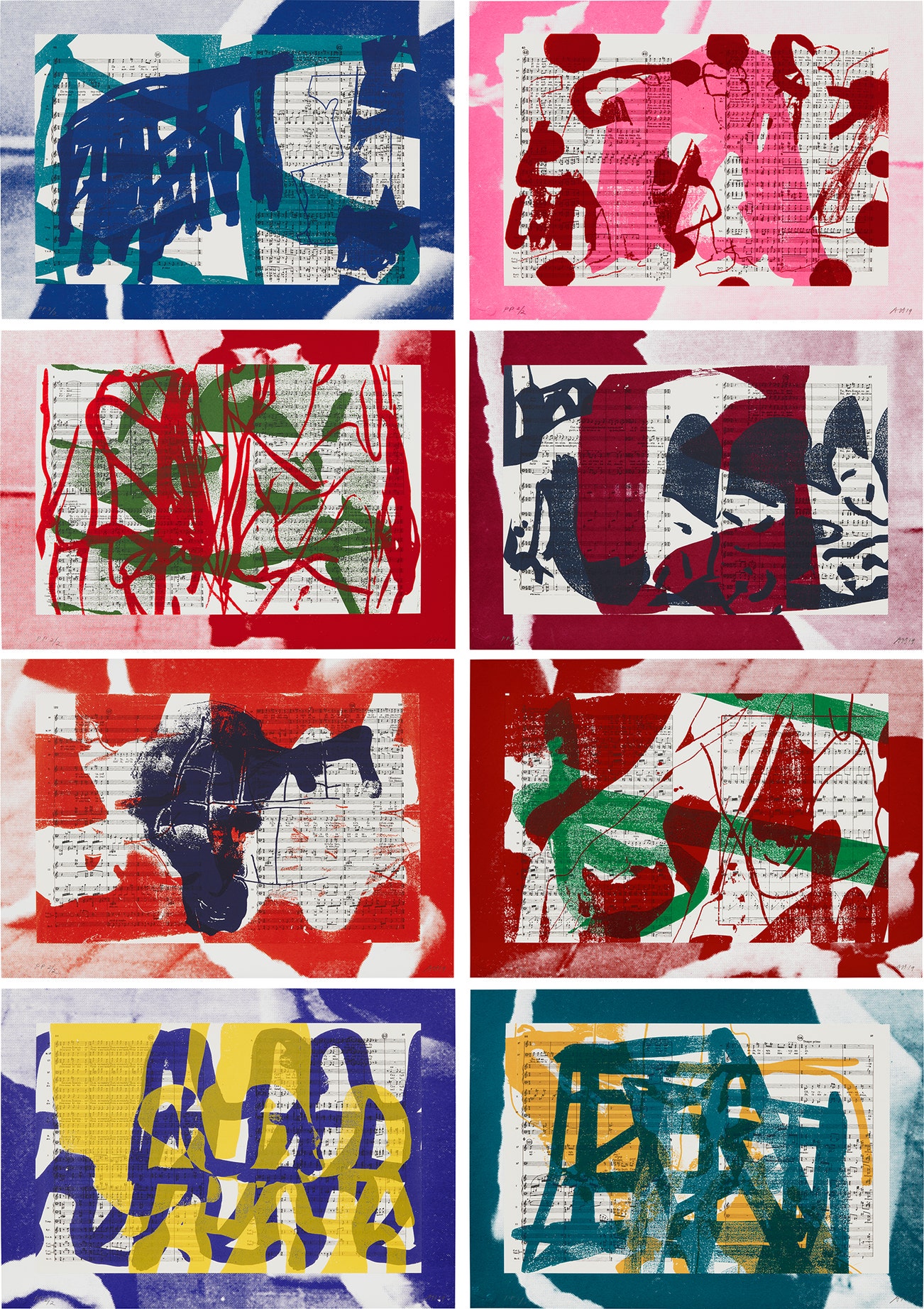 The complete set of eight screenprints in colors with collage, on Coventry Rag and Rives Lightweight papers, the full sheets.