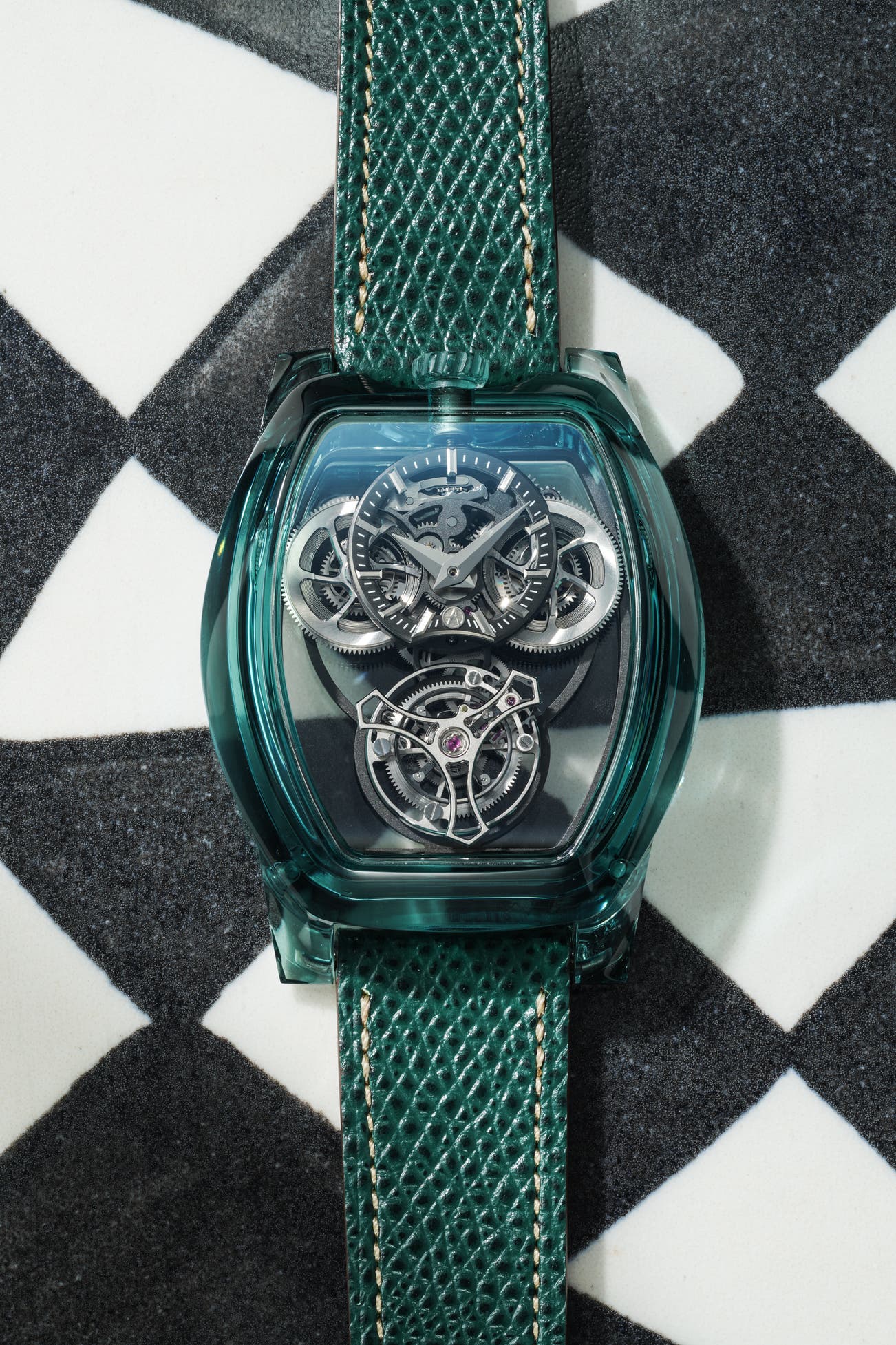 - The emerald green sapphire case (that takes over 200 hours to mill and hand polish) houses what seems to be a suspended architectural movement with sand-blasted cast iron bridges.
