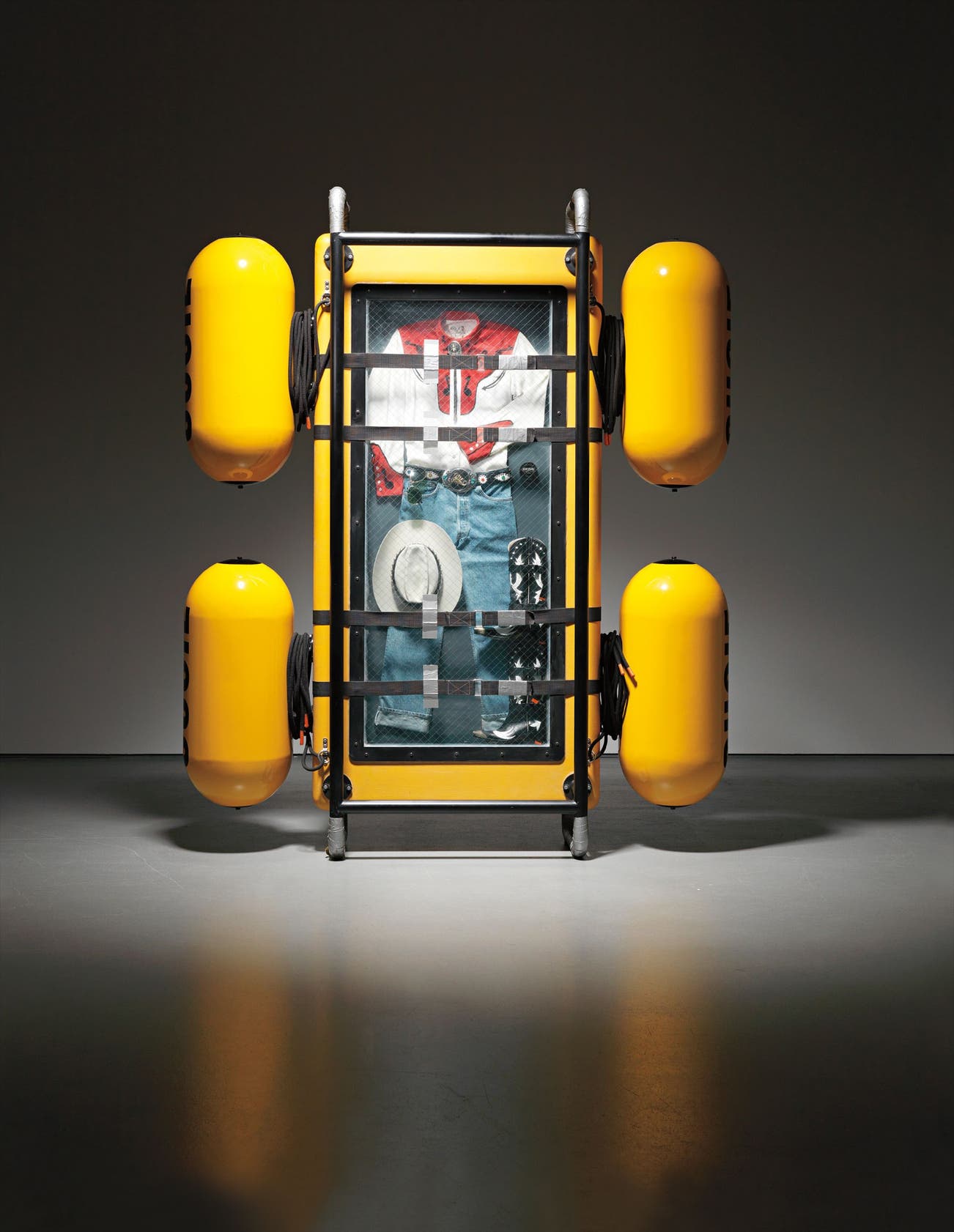 cowboy suit, glass, aluminum, wood, caulk, fiberglass, enamel, canvas webbing, gaffa tape