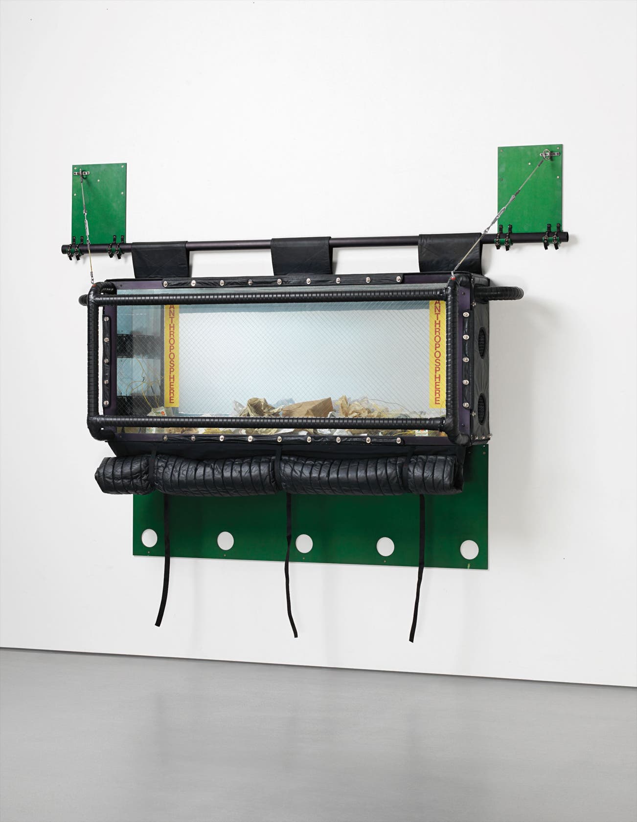 anodized aluminium, wood, rubber, leather, glass and studio garbage