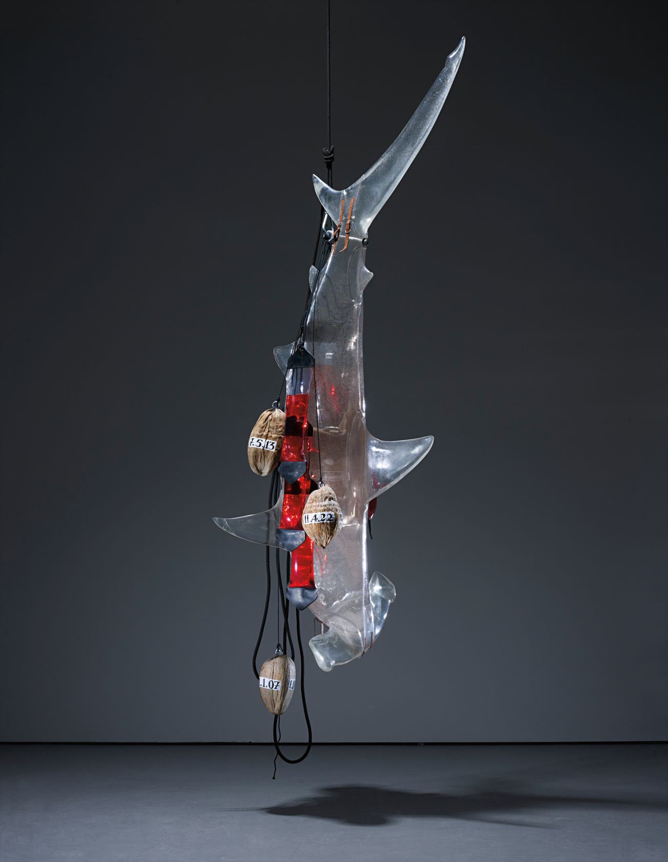 In Ashley Bickerton’s Bismarck Achipelago Shark, we see the eponymous hammer-head stung from a hook. Deflated of blood and hanging limply like an empty sack, it is a gruesome and poignant sight.