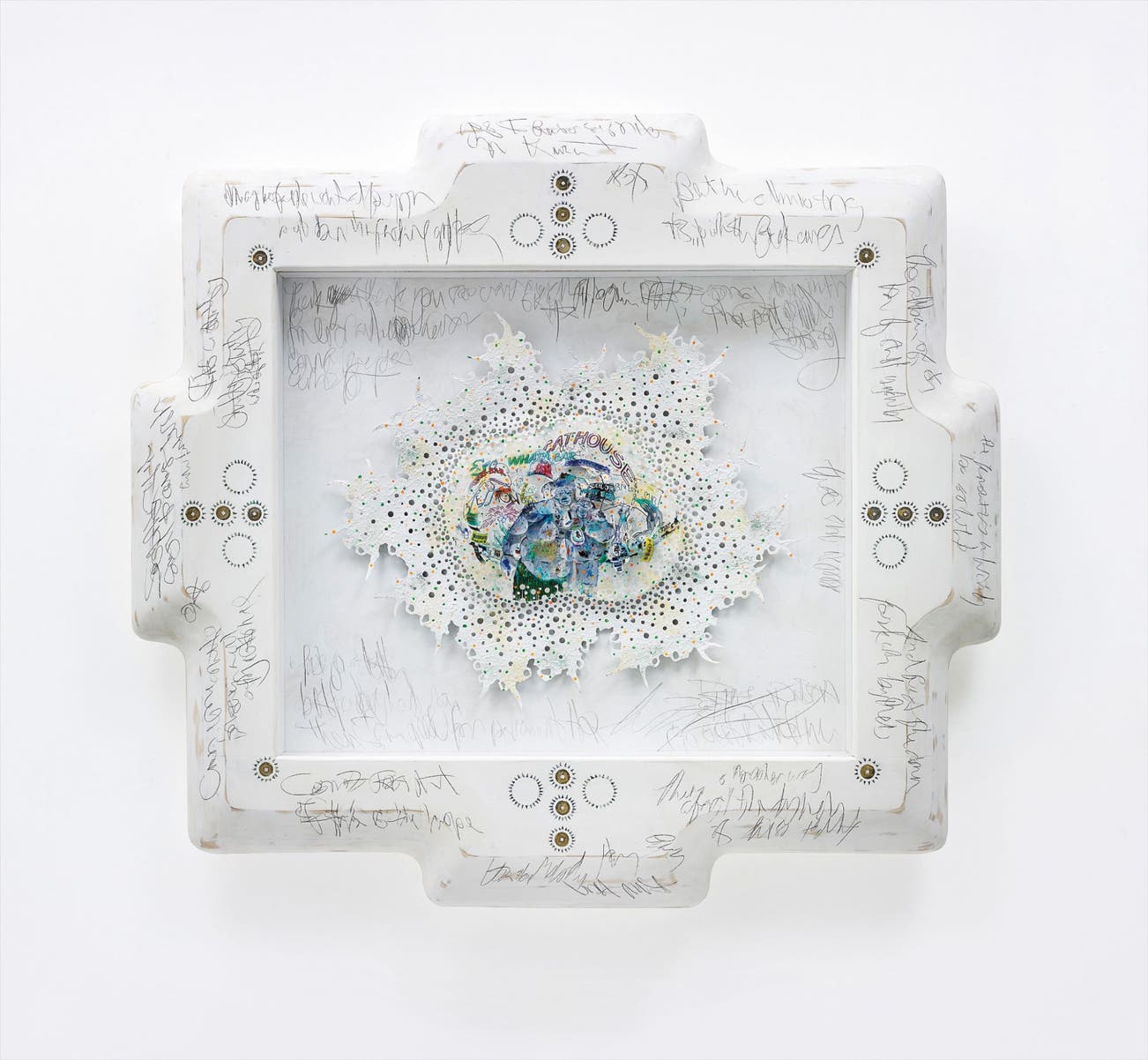 acrylic, digital print, insect pins on paper
