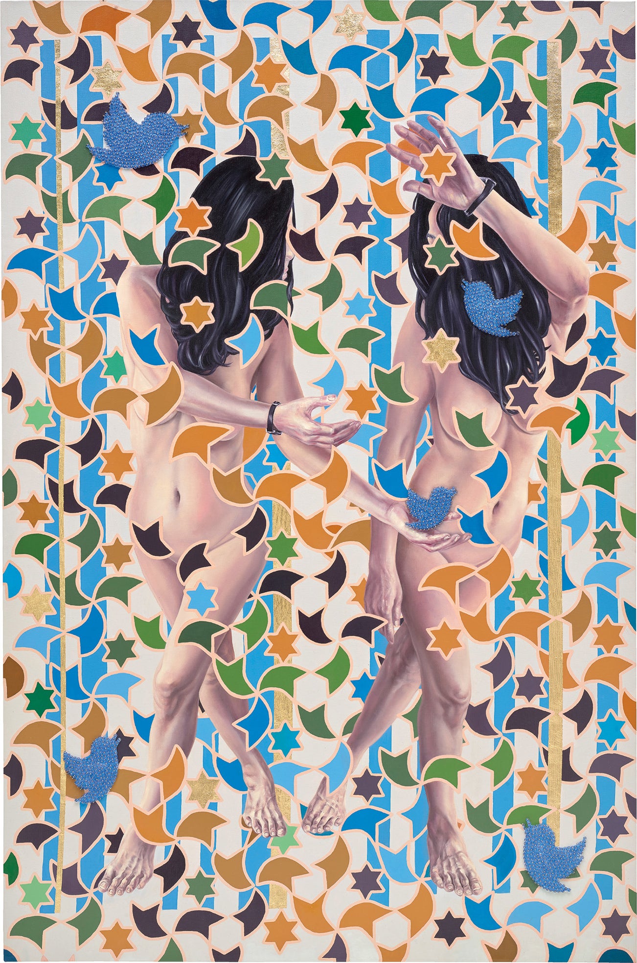 oil, blue Swarovski beads, gold beads and gold leaf on canvas