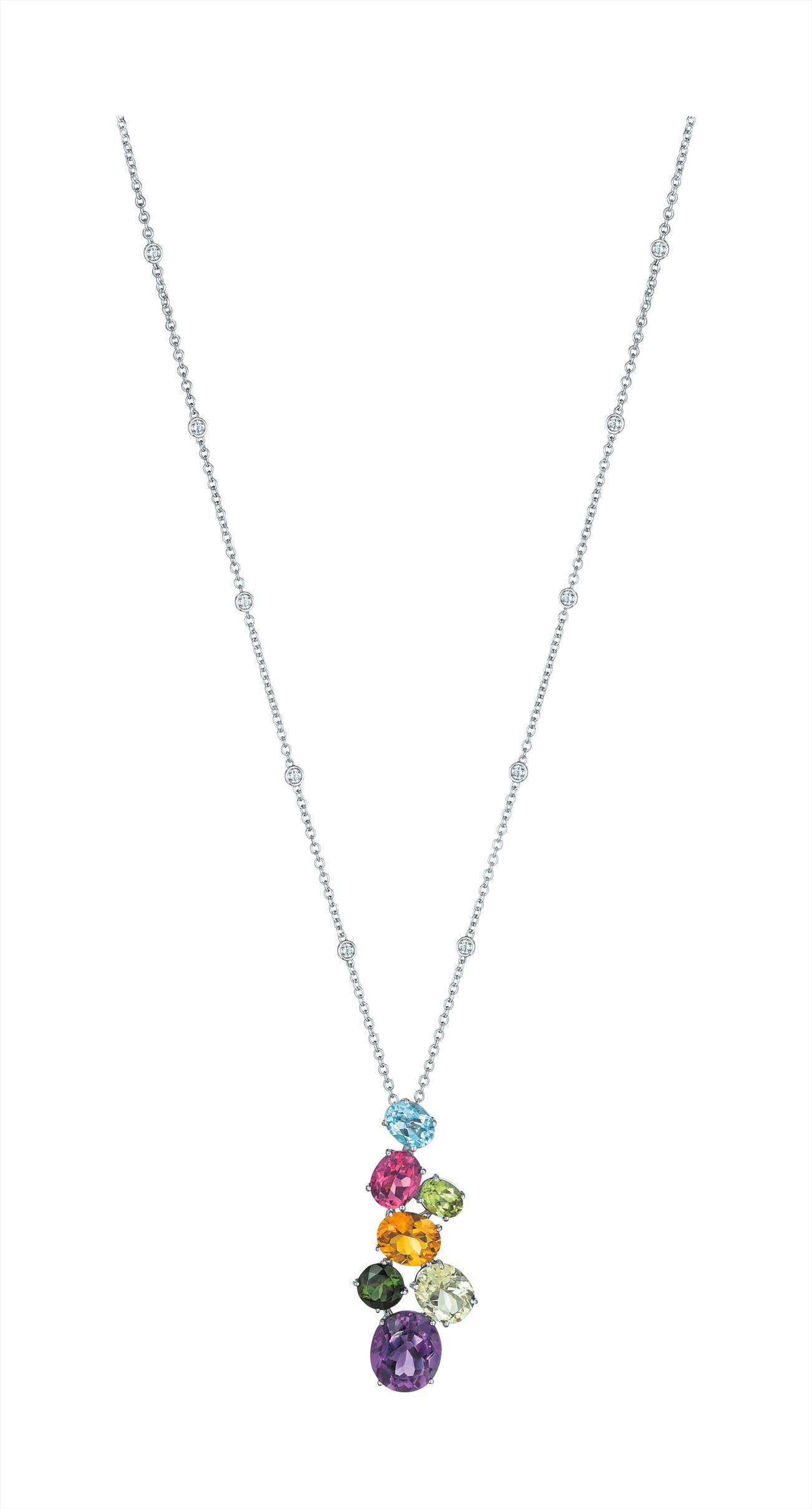 Designed as a linear cluster of vari-cut blue topaz, pink tourmaline, peridot, citrine, green tourmaline, lemon quartz, and amethyst, suspended from a fine link chain enhanced by spectacle-set diamonds, mounted in 18K white gold, chain length 16 to 18 inches, pendant length 1 7/8 inches.