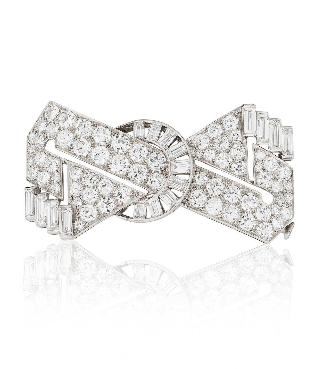 Of geometric design, set with circular-cut and baguette diamonds, measuring approximately 45 x 20mm, signed Asprey.
